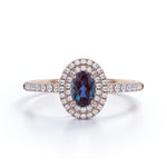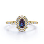 Be on cloud nine with this Classic Double Halo 1.50 Carat Oval Cut Simulated Blue Alexandrite and Diamond Semi Eternity Pave Engagement Ring in White Gold. This classic pave blue Alexandrite engagement ring features 1 carat oval cut synthetic Alexandrite and .50 carat real side diamond for gold ring and moissanite for silver ring. This double halo Alexandrite ring can be customized to either 10k, 14K and Gold over Silver and either Black Gold, Rose Gold, White Gold or Yellow Gold. Also, as your satisfaction is our most priority, we will do our best to have your handmade jewelry be carefully and beautifully crafted by our expert jewelers. The order also comes with a 30-day full refund policy. Enrich your charm and charisma with this vintage mystic lab grown Alexandrite ring for women that is excellent for everyday wear. With its unique ability to exhibit two colors, this artificial Alexandrite ring will make you stand out from others. If you are looking for the encouragement to love and romance, this antique lab grown Alexandrite ring is right for you. Enrich your charming love story and strengthen your bond with this color-change man made Alexandrite ring. This simulated Alexandrite ring gives a vivid grass green color in daylight and displays an intense raspberry red in candescent light. Embellish your love story with this beautiful man made Alexandrite ring and make it even more memorable. This ring will surely complement every style of its wearer. This engagement ring will create a timeless and fabulous look on your finger. Sparkle your finger with this mystic lab made Alexandrite ring which is perfect for any occasion and everyday wear. Handcrafted with love, this antique man made Alexandrite ring will complement any style and enhance the charm of its wearer.