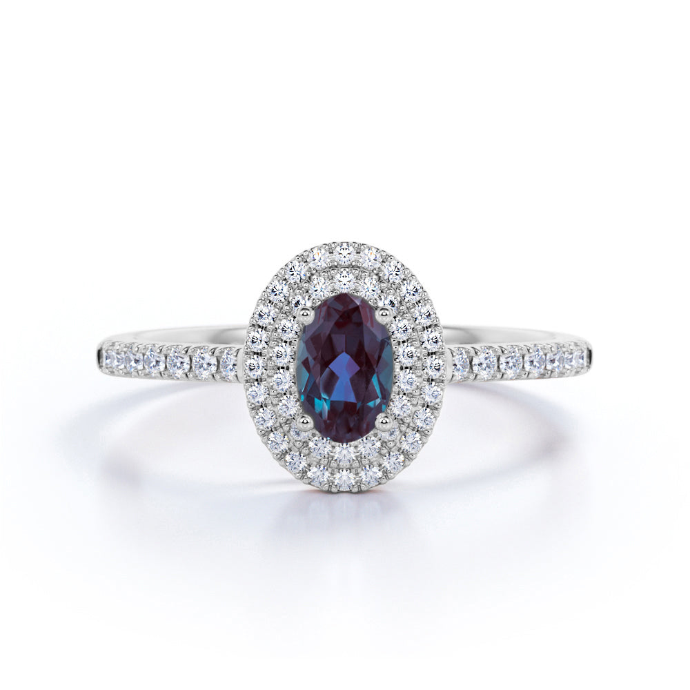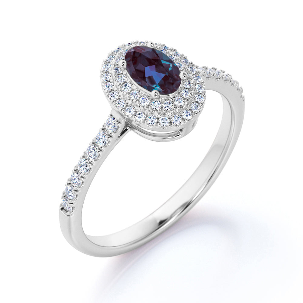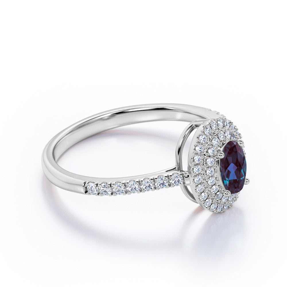 Classic Double Halo 1.50 Carat Oval Cut Simulated Blue Alexandrite and Diamond Semi Eternity Pave Engagement Ring in White Gold