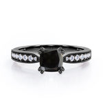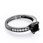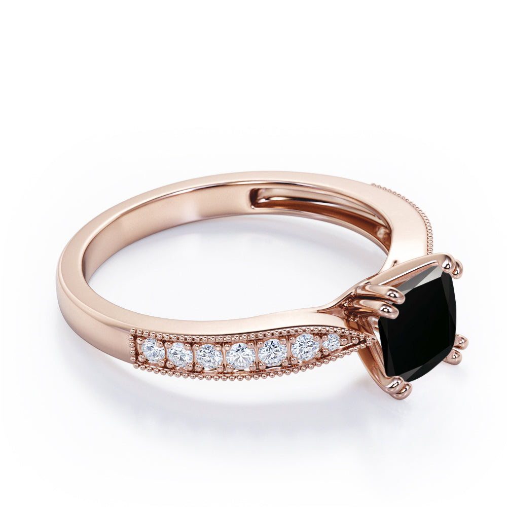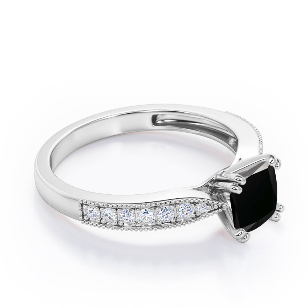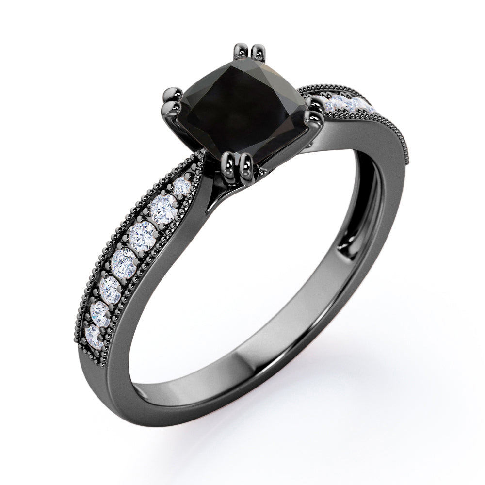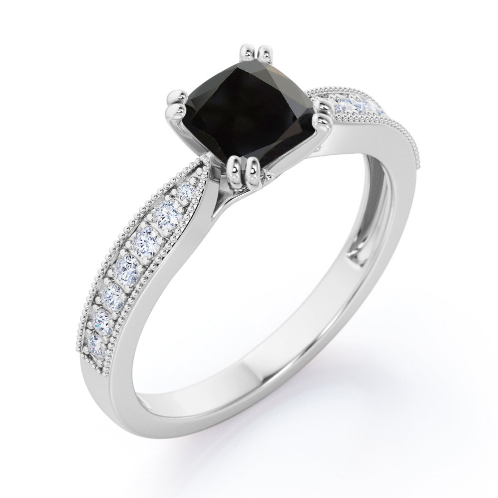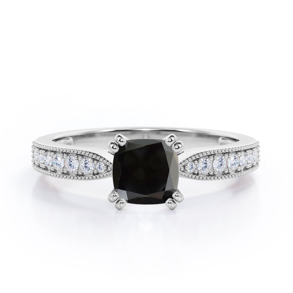 Classic Eight Prongs 1.25 Carat Cushion Cut Black Diamond Vintage Milgrain Engagement Ring In White Gold. Own this splendid black diamond ring which displays one of the most remarkable sparkle and stand out from the rest. This flawless engagement ring will be a perfect match for those who are looking for beautiful, classic, and unique pieces of fine jewelry. One carat cushion cut black diamond stone sits in eight prongs at the center radiating its own brilliance and is surrounded by 0.25 carat of white sizzling diamonds. The pave set diamonds in white gold band illuminates amazing brilliance. Handmade with utmost sincerety, this beaded eight prongs 1.25 carat cushion cut black diamond vintage milgrain engagement ring in white gold can also be customized to 10k Gold or 14k Gold as you desire.