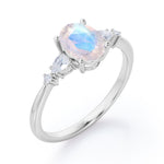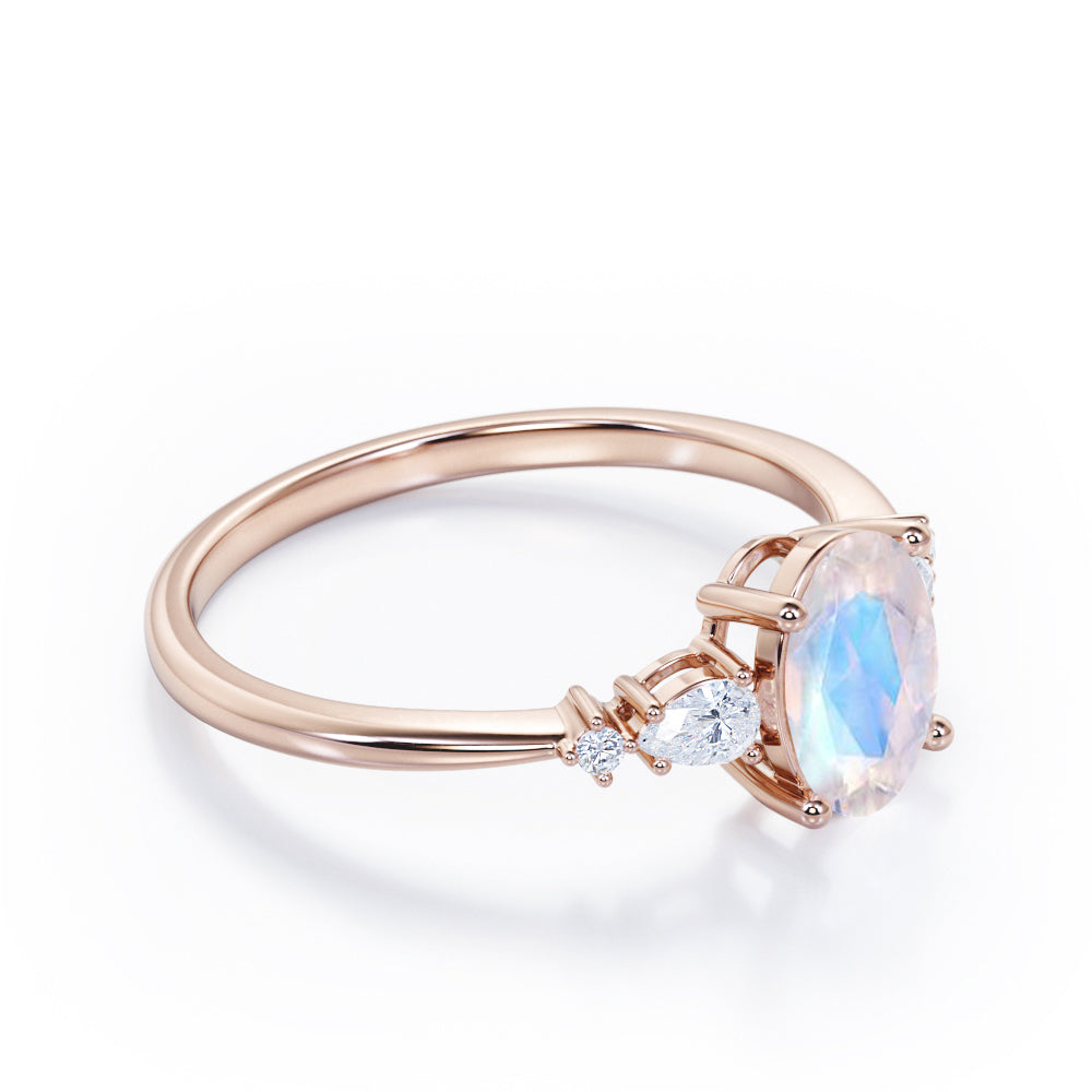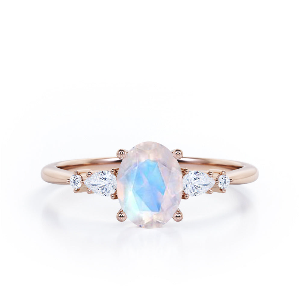 Classic Five Stone 0.6 carat Oval Moonstone and Diamond Engagement Ring in Rose Gold displays a 0.5 carat oval Moonstone and flanked by pear shape diamonds which is also know as tear drop cut, symbolizing a happy tear on your big special moment, in east-west setting and followed by dainty round diamonds on each side. This promise ring is very simple yet elegant, the sparkle of each stone enhances and compliments each other perfectly. The ring can be customized to your choice of white gold, rose gold, yellow gold and black gold.