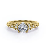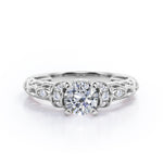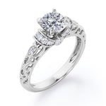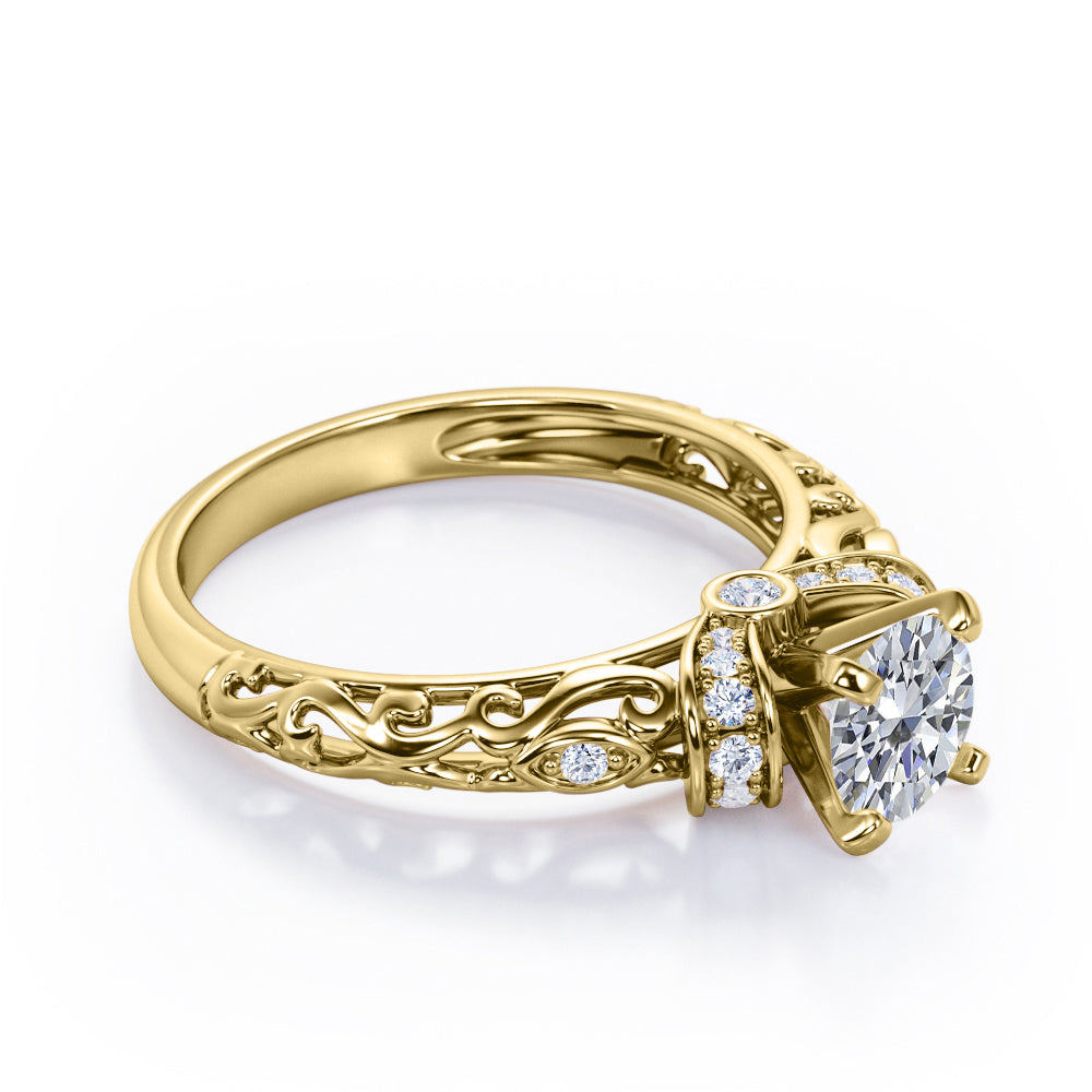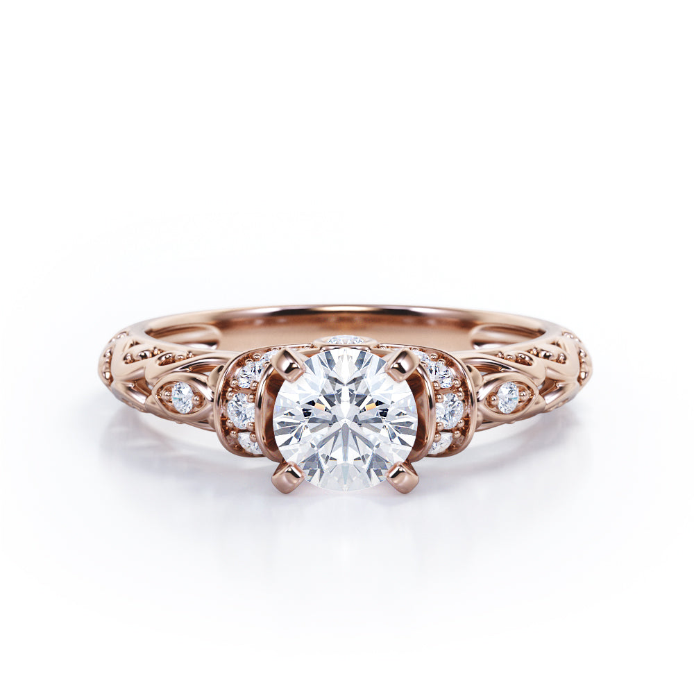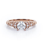 Classic Four Prong 0.45 Carat Round Cut Diamond Art Deco Engagement Ring In Rose Gold. Effortless and elegant, this is an alluring piece you're bound to love forever.The most whimsical bride won't be able to resist this aesthetically pleasing ring featuring a striking round cut diamond ring. This Diamond engagement ring will create a timeless look on your finger. This antique engagement ring features 0.33 carat round shaped diamond at the center and 0.12 carat of dainty round cut white diamonds set on a plating around the center stone. This prong set ring gives a timeless and classic look. The art deco work in this piece highly commendable work of our experienced craftsmen who created it with their own hands to offer you a variety. As all our products are handmade by our experienced artisans, this classic four prong 0.45 carat round cut Diamond art deco engagement ring in rose gold can also be customized to 10k Gold or 14k Gold as per your preference.