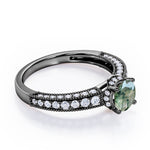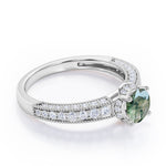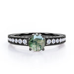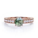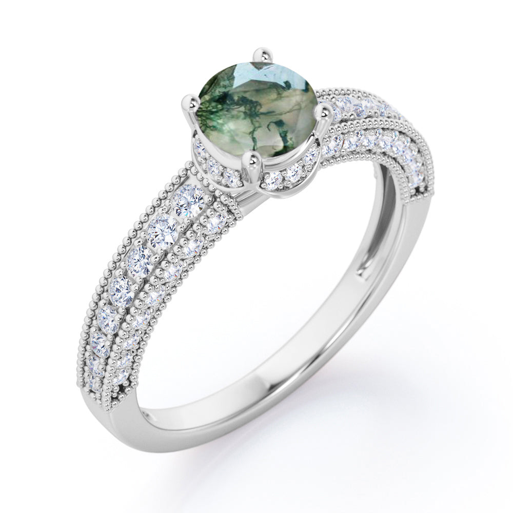Classic Four Prong 1.45 Carat Round Cut Green Moss Agate And Diamond Vintage Milgrain Engagement Ring In Rose Gold. If you are an outside-the-box kind of person, then our exquisite Green Moss Agate and diamond engagement ring is a great choice. Set in classic four prong setting, this brilliant round cut green moss agate stone radiates deep jewel tones. This alluring ring is perfect for vintage lovers with an art deco milgrain edging all around the band. This vintage inspired engagement ring features 1 carat green moss agate as the center stone and 0.45 carat of sparkling white diamonds. Handmade with utmost love and detailed attention, this green moss agate and diamond engagement ring is certainly a bold choice that will stand out. This classic four prong 1.45 carat round cut green moss agate and diamond vintage milgrain engagement ring in rose gold can also be customized to 18k Gold plating over silver, 10k Gold, 14k Gold as per your preference. Please note that if the ring is made over silver, the side stone will be moissanite and if it is made on gold, diamond will be employed as the side stone.