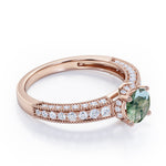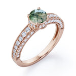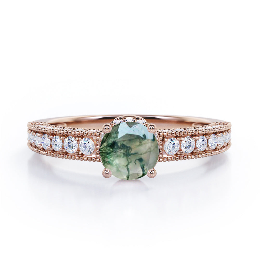 Classic Four Prong 1.45 Carat Round Cut Green Moss Agate And Diamond Vintage Milgrain Engagement Ring In Rose Gold