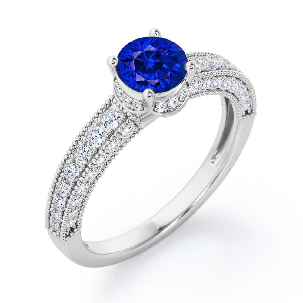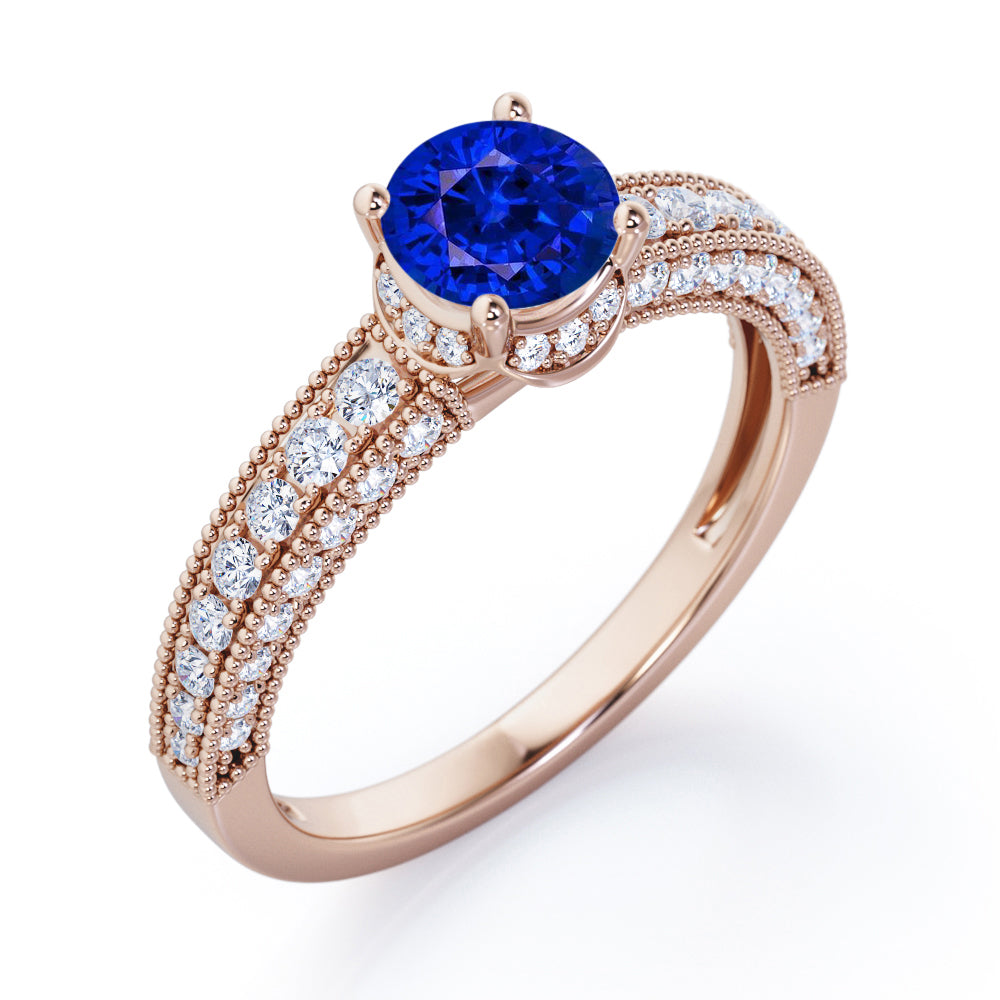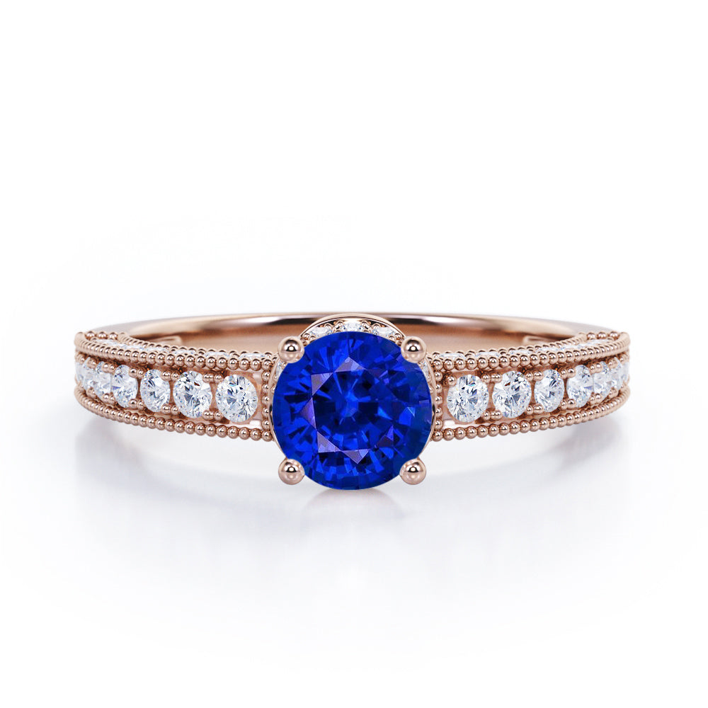 Classic Four Prong 1.45 Carat Round Cut Lab-Created Sapphire And Diamond Vintage Milgrain Engagement Ring In Rose Gold. If you are an outside-the-box kind of person, then our exquisite Lab-Created sapphire and diamond engagement ring is a great choice. Set in classic four prong setting, this brilliant round cut sapphire stone radiates deep jewel tones. This alluring ring is perfect for vintage lovers with an art deco milgrain edging all around the band. This vintage inspired engagement ring features 1 carat Lab-Created sapphire as the center stone and 0.45 carat of sparkling white diamonds. Handmade with utmost love and detailed attention, this Lab-Created sapphire and diamond engagement ring is certainly a bold choice that will stand out. This classic four prong 1.45 carat round cut Lab-Created sapphire and diamond vintage milgrain engagement ring in rose gold can also be customized to 18k Gold plating over silver, 10k Gold, 14k Gold as per your preference. Please note that if the ring is made over silver, the side stone will be moissanite and if it is made on gold, diamond will be employed as the side stone.
