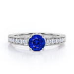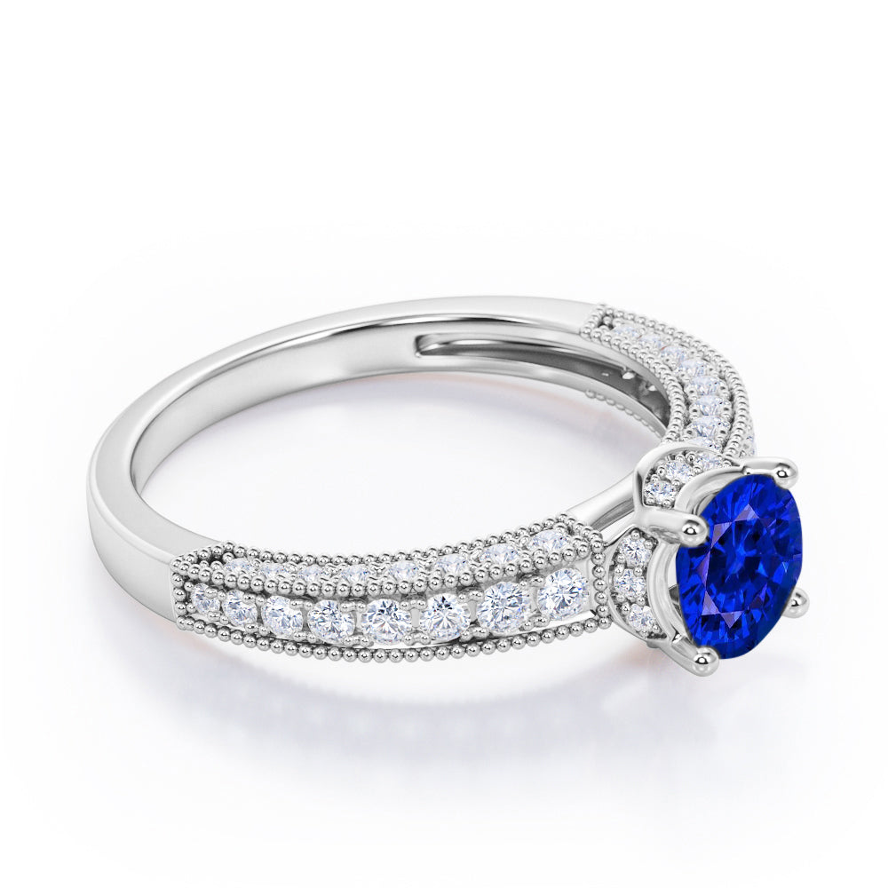 Classic Four Prong 1.45 Carat Round Cut Lab-Created Sapphire And Diamond Vintage Milgrain Engagement Ring In Rose Gold. If you are an outside-the-box kind of person, then our exquisite Lab-Created sapphire and diamond engagement ring is a great choice. Set in classic four prong setting, this brilliant round cut sapphire stone radiates deep jewel tones. This alluring ring is perfect for vintage lovers with an art deco milgrain edging all around the band. This vintage inspired engagement ring features 1 carat Lab-Created sapphire as the center stone and 0.45 carat of sparkling white diamonds. Handmade with utmost love and detailed attention, this Lab-Created sapphire and diamond engagement ring is certainly a bold choice that will stand out. This classic four prong 1.45 carat round cut Lab-Created sapphire and diamond vintage milgrain engagement ring in rose gold can also be customized to 18k Gold plating over silver, 10k Gold, 14k Gold as per your preference. Please note that if the ring is made over silver, the side stone will be moissanite and if it is made on gold, diamond will be employed as the side stone.
