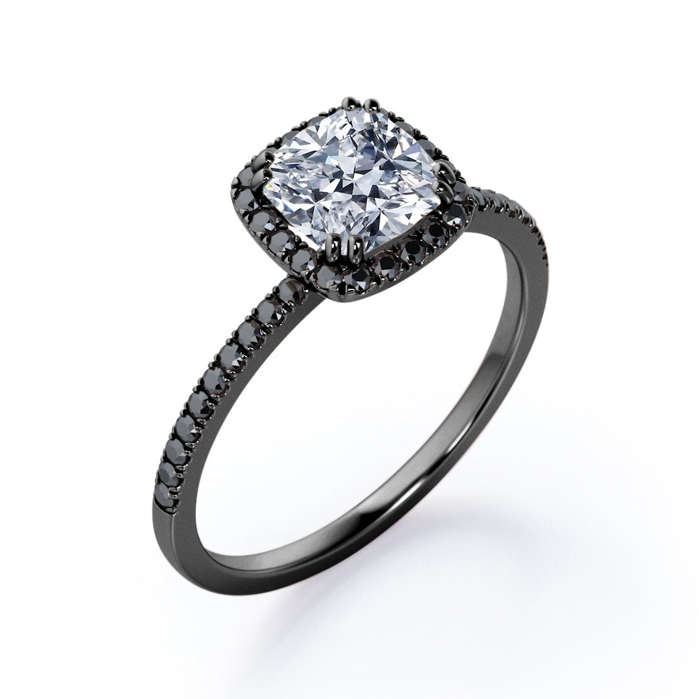 Start the greatest love story of your life with this Classic Halo Setting - 1.5 TCW Cushion Cut Moissanite with Lab Created Black Diamond - Pave Style Engagement Ring in Black gold. Skillfully hand-cut into a nice cushion cut by our experts in lapidary, this alluring moissanite stone ring consists of total 1.5 carat moissanite and lab-created black diamonds. Special and non-traditional, this white moissanite engagement ring is perfect for those who would love to express their charisma and uniqueness. With naked eyes moissanites look, shine and feel exactly like diamonds. With its splendor, this moissanite stone ring will unquestionably be an essential additional to any jewelry collection. This moissanite stone ring is beautiful and accessible since it is available at a reasonable price. Moissanites are the most popular alternative gemstone for diamonds while being at lower and more affordable price. Considered as a symbol of timeless love and affection for your lover, this moissanite stone ring can be a good choice for any special occasion, i.e. a birthday ring, an engagement or marriage proposal ring, a Valentines' day ring, etc. Also, this moissanite band can be customized to your own choice of metal colors: White gold, rose gold, yellow gold and black gold in 18k Gold over Silver, 10k and 14k gold metal options. In regards to its hardness, moissanite is almost as hard as diamond which means that it is notably durable. Let's fulfill your love story with this moissanite promise ring, and she will be eternally joyful.