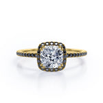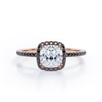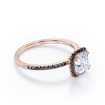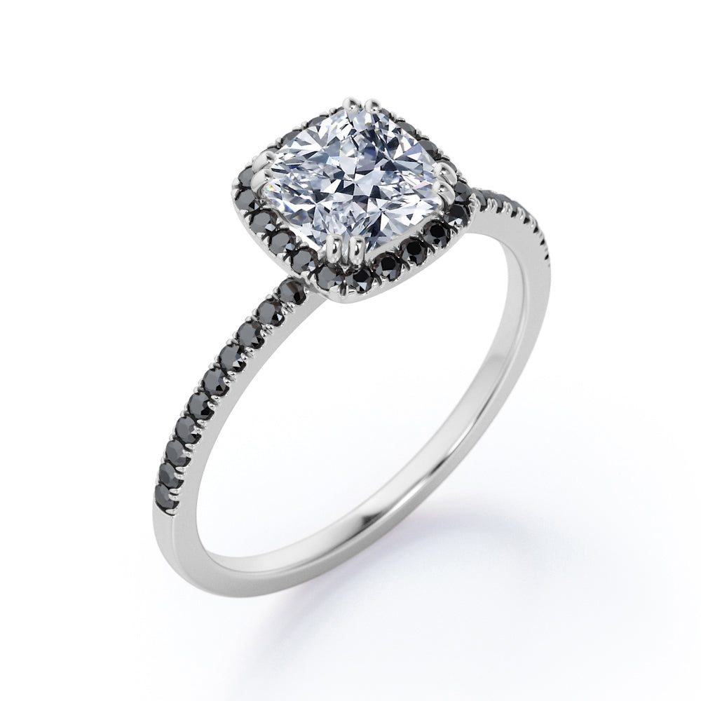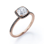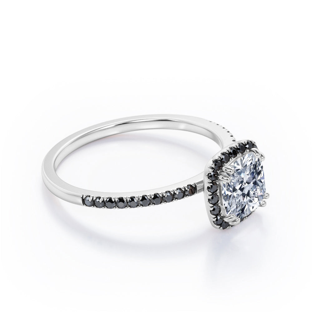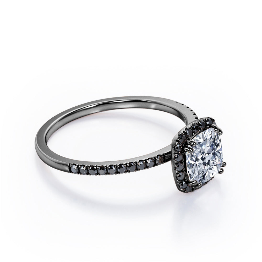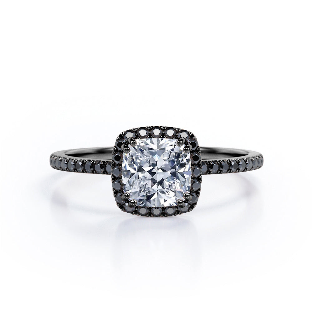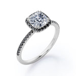 Start the greatest love story of your life with this Classic Halo Setting - 1.5 TCW Cushion Cut Moissanite with Lab Created Black Diamond - Pave Style Engagement Ring in Black gold. Skillfully hand-cut into a nice cushion cut by our experts in lapidary, this alluring moissanite stone ring consists of total 1.5 carat moissanite and lab-created black diamonds. Special and non-traditional, this white moissanite engagement ring is perfect for those who would love to express their charisma and uniqueness. With naked eyes moissanites look, shine and feel exactly like diamonds. With its splendor, this moissanite stone ring will unquestionably be an essential additional to any jewelry collection. This moissanite stone ring is beautiful and accessible since it is available at a reasonable price. Moissanites are the most popular alternative gemstone for diamonds while being at lower and more affordable price. Considered as a symbol of timeless love and affection for your lover, this moissanite stone ring can be a good choice for any special occasion, i.e. a birthday ring, an engagement or marriage proposal ring, a Valentines' day ring, etc. Also, this moissanite band can be customized to your own choice of metal colors: White gold, rose gold, yellow gold and black gold in 18k Gold over Silver, 10k and 14k gold metal options. In regards to its hardness, moissanite is almost as hard as diamond which means that it is notably durable. Let's fulfill your love story with this moissanite promise ring, and she will be eternally joyful.