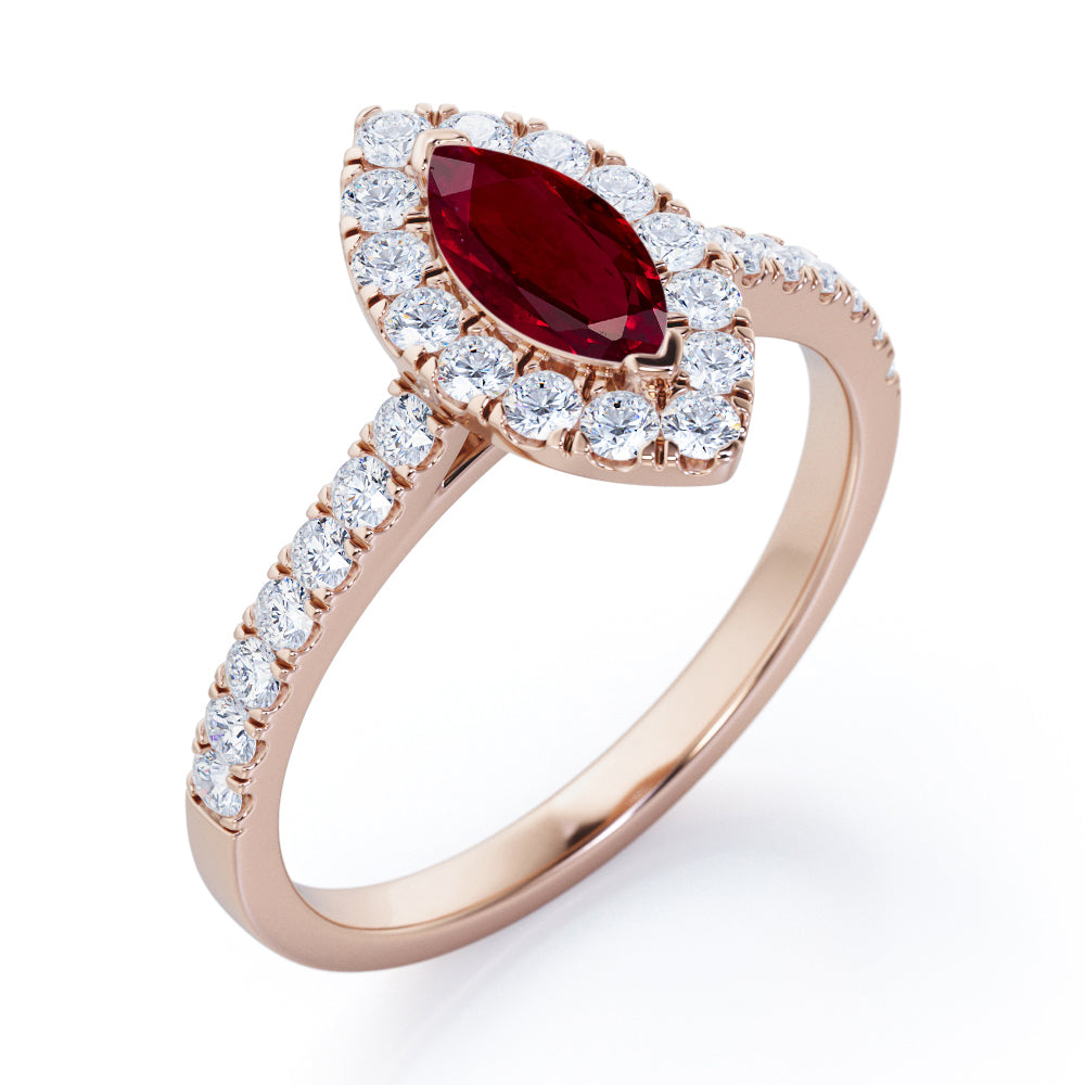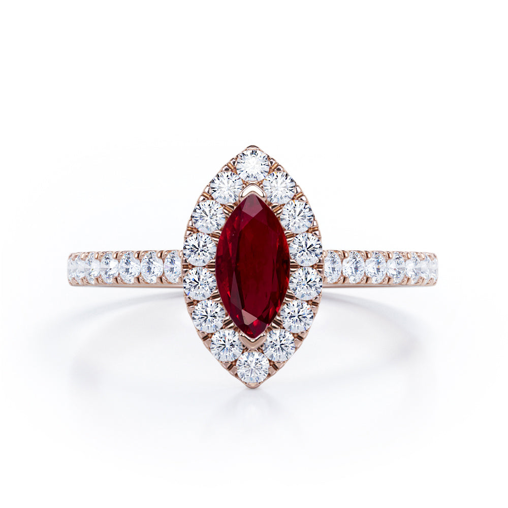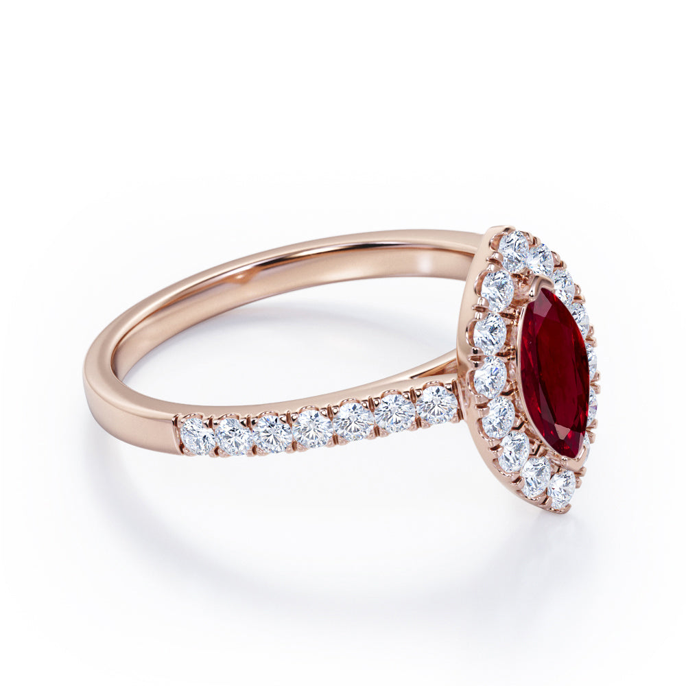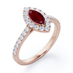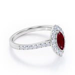 Another stone shape from our classic halo collection. A Classic Marquise 1 carat Marquise Lab Ruby and Diamonds Engagement Ring in White Gold. The promise ring displays a 0.5 carat marquise Lab Ruby which surrounded by round paved diamonds as an accent. Hall of the band is also glistened by more petite round diamonds that enhance the sparkle of the ring. This simple design not only elegant but it symbolized the simplicity of lifestyle your partner has. It can be easily matched with any attire in all kind of occasions. You can choose either 18k gold over silver,10k gold or 14k gold to be the metal of your ring. Moreover, you can choose a color that will fit your special someone most, 4 colors are up for you to select; white gold, rose gold, yellow gold and black gold.