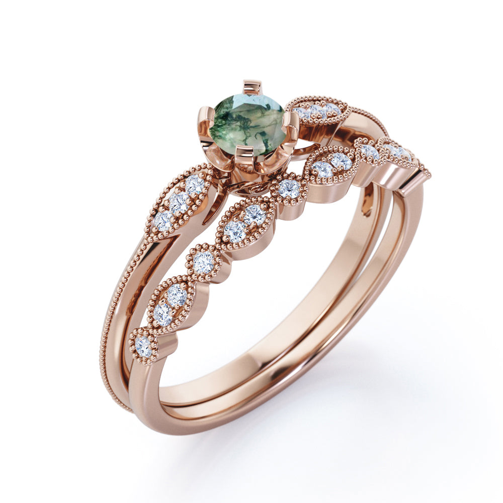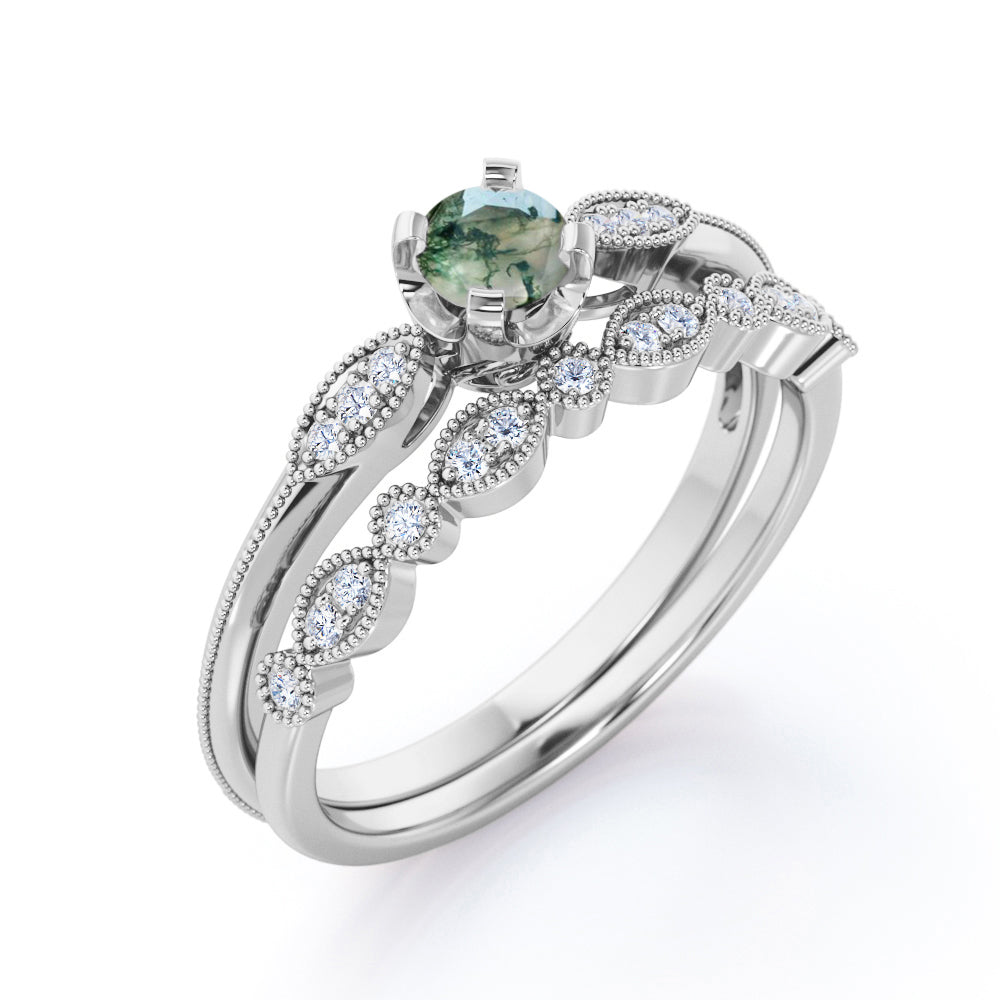 Classic Milgrain 1.50 Carat Round Cut Genuine Banded Moss Green Agate and Diamond Marquise Dot Art Deco band Bridal Set Rings