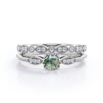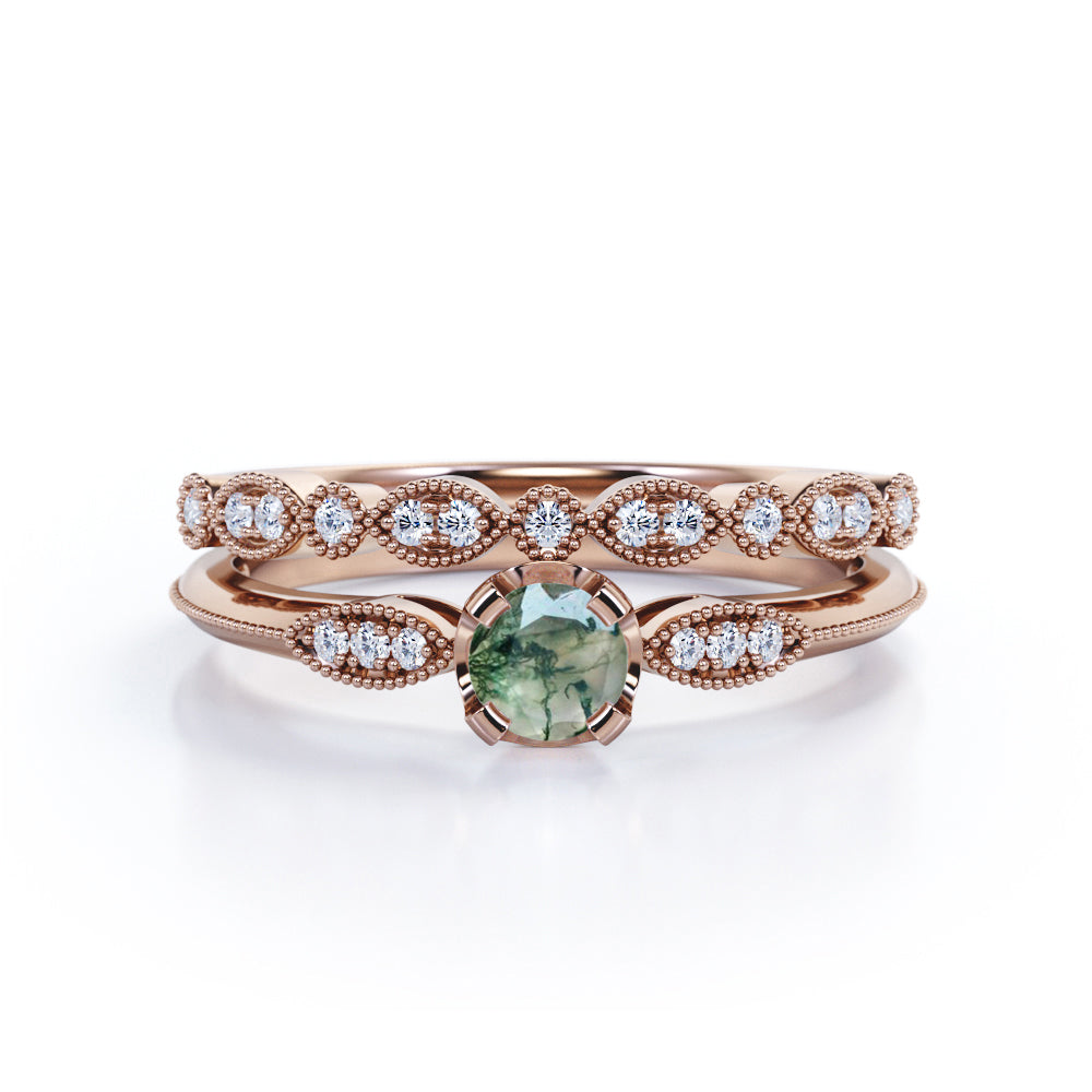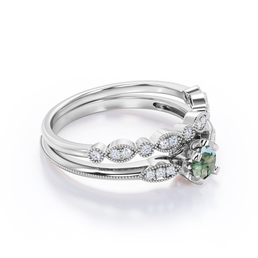 Classic Milgrain 1.50 Carat Round Cut Genuine Banded Moss Green Agate and Diamond Marquise Dot Art Deco band Bridal Set Rings