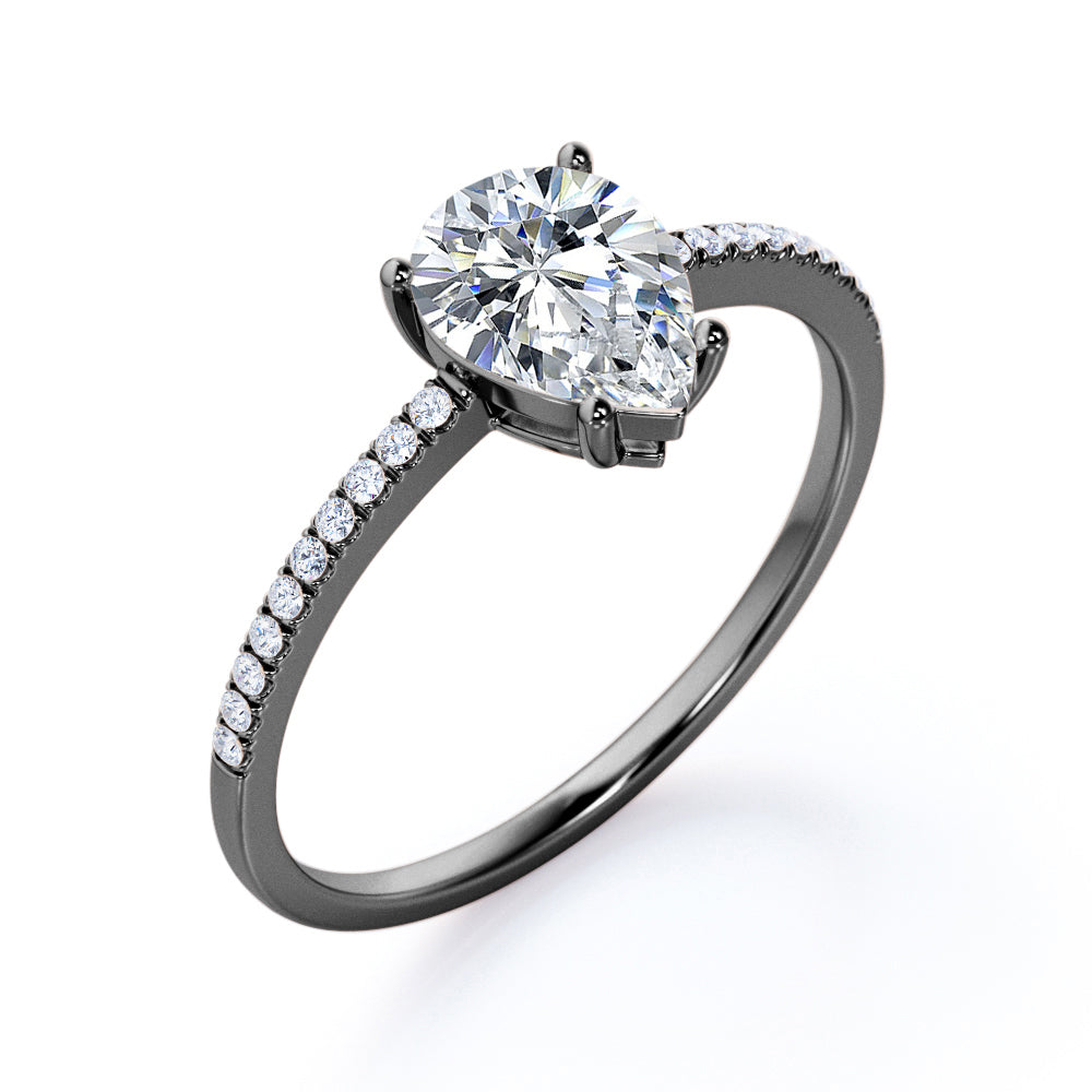 Our all time best selling collection, the Classic Pave 0.7 carat Pear Moissanite and diamond Engagement Ring in White Gold. The ring showcases a 0.5 carat pear Moissanite on the dainty paved round Moissanite band. The ring can be worn upside down; if the pointy part point forward the sky, it will look like a fruit or a water drop, some believe it is a happy tear on your special moment or you can wear it the other way around and it will give you a different look. The ring is available in 4 colors; white gold, rose gold, yellow gold, black gold and you can choose the metal between 18k gold over silver, 10k gold or 14k gold.