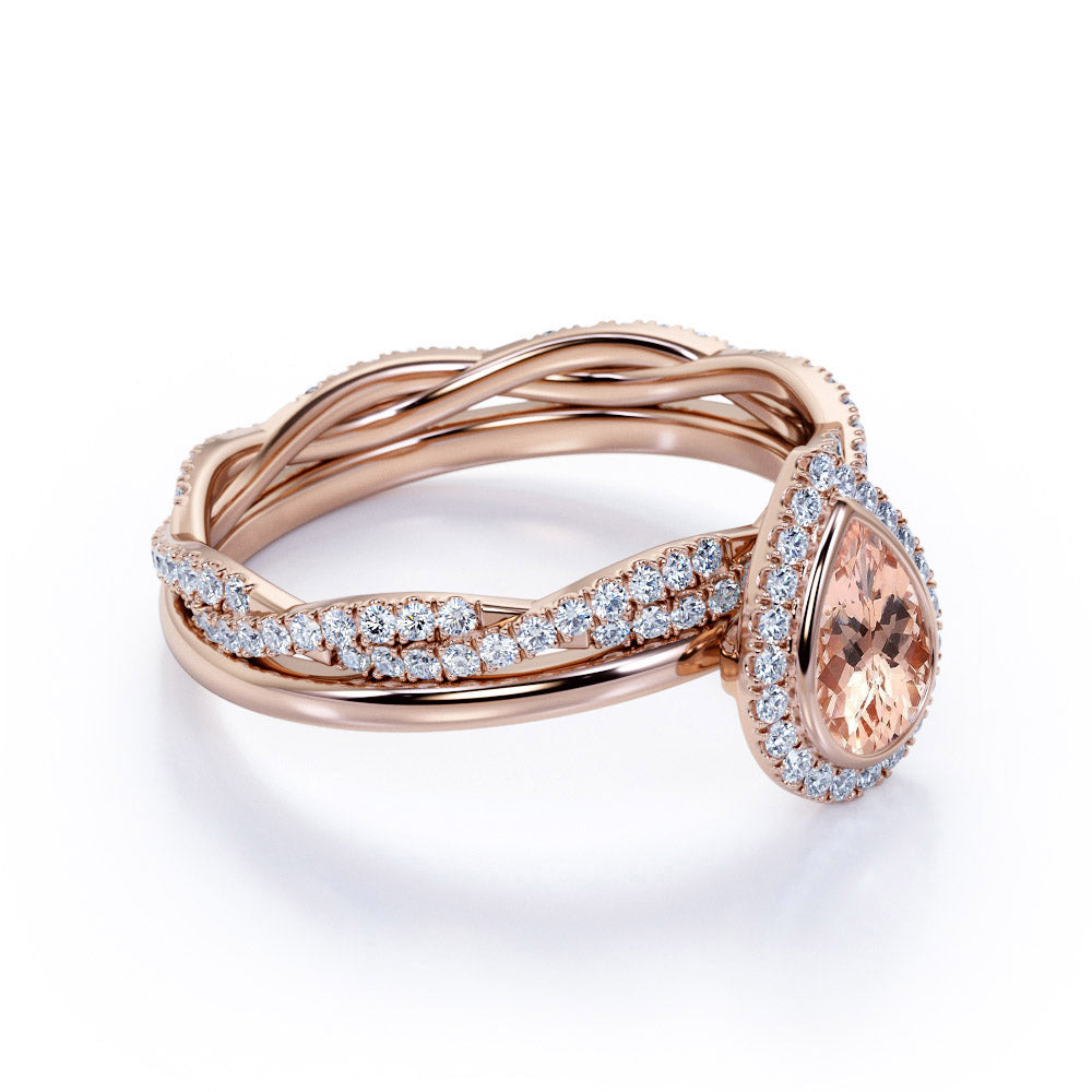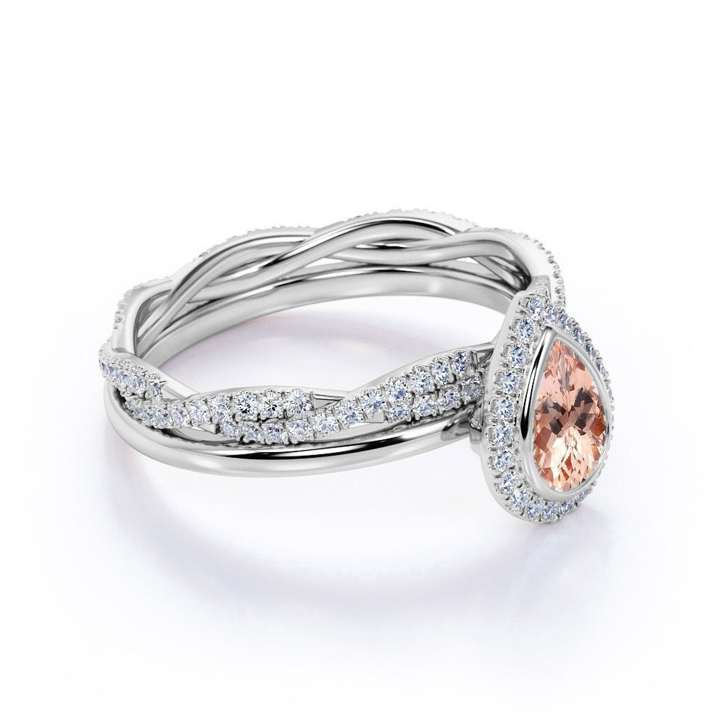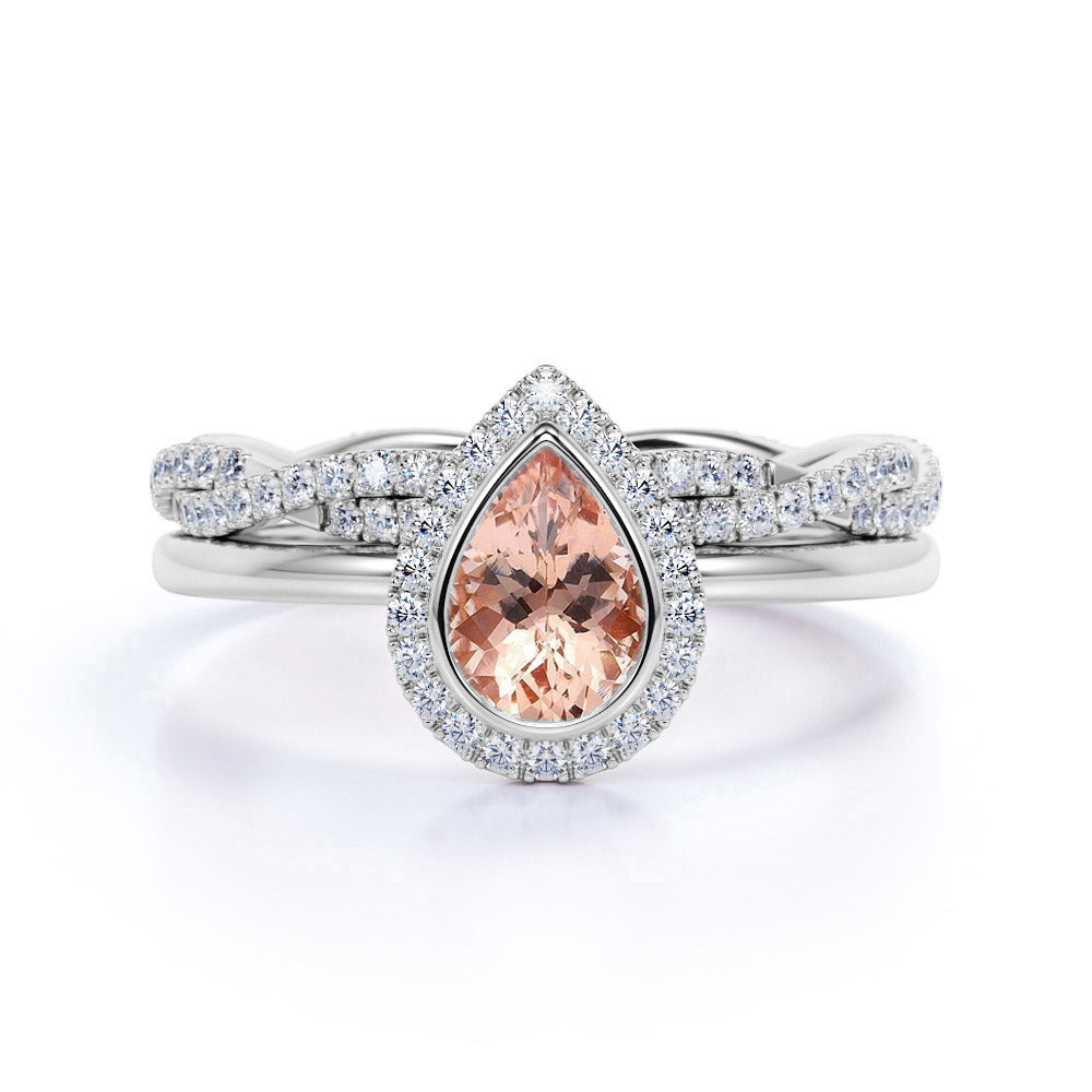 Classic Pave 1.75 Carat Pear Shape Morganite and Diamond Halo Bridal Set with Infinity Band in White Gold