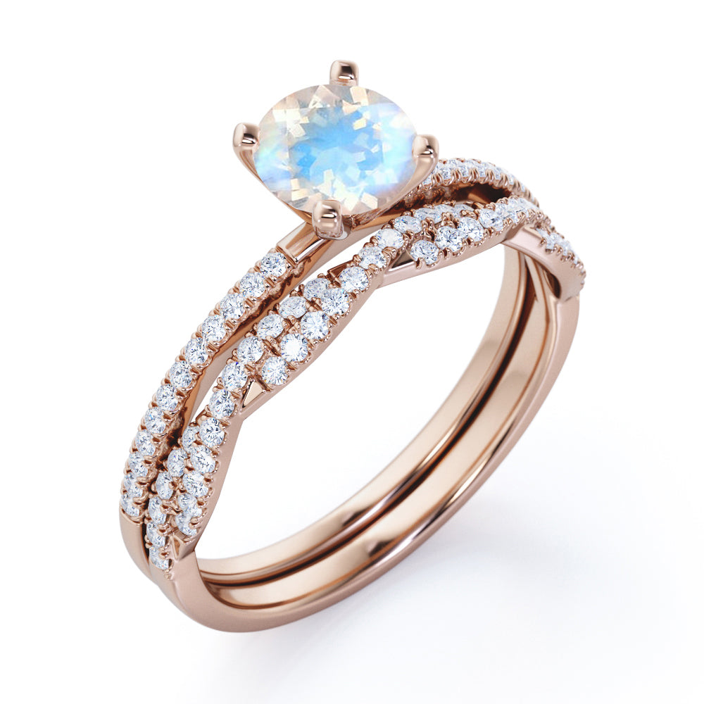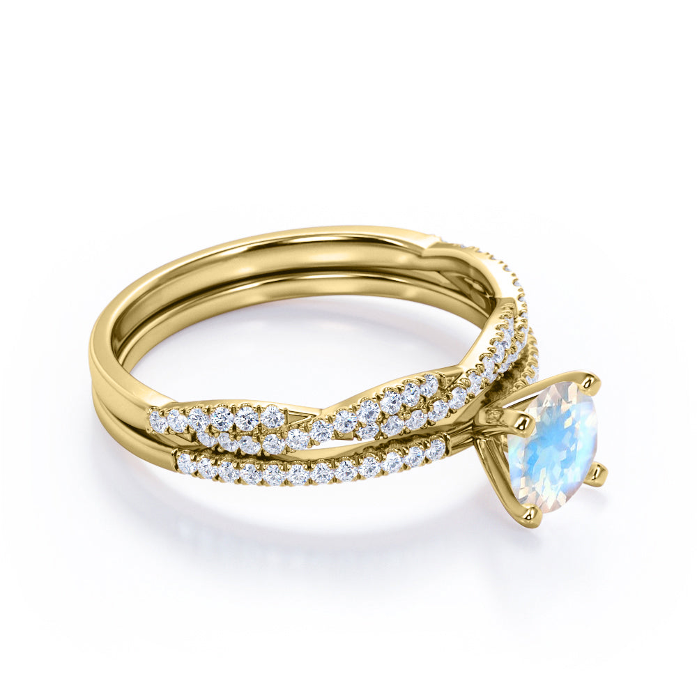 The Classic Pave Round 1 carat Round Moonstone and Moissanite Wedding Ring Set in White Gold contains 2 rings; a beautiful Moonstone engagement ring and a twisted wedding band. The promise ring holds a 0.5 carat round Moonstone in prong setting, elevating among all. Prong is one of the popular design since it shows a lor of gemstone's surface and all the light to pass through. On the shoulder of the ring through half of the band, paved round Moissanite is adorned and adds some sparkles to the ring. Half infinity wedding band illustrates a finite sign where it represents the endless love and time. This bridal set can be made in 18k gold over silver, 10k gold and 14k gold with the color of white gold, rose gold, yellow gold and black gold.