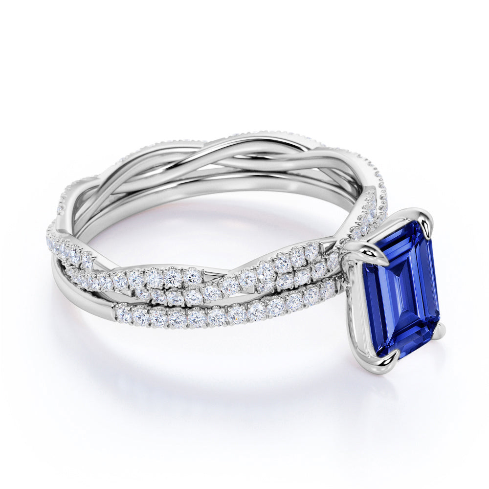 Classic Prong Set 2 Carat Emerald Cut Sapphire and Diamond Infinity Bridal Ring Set in White Gold
