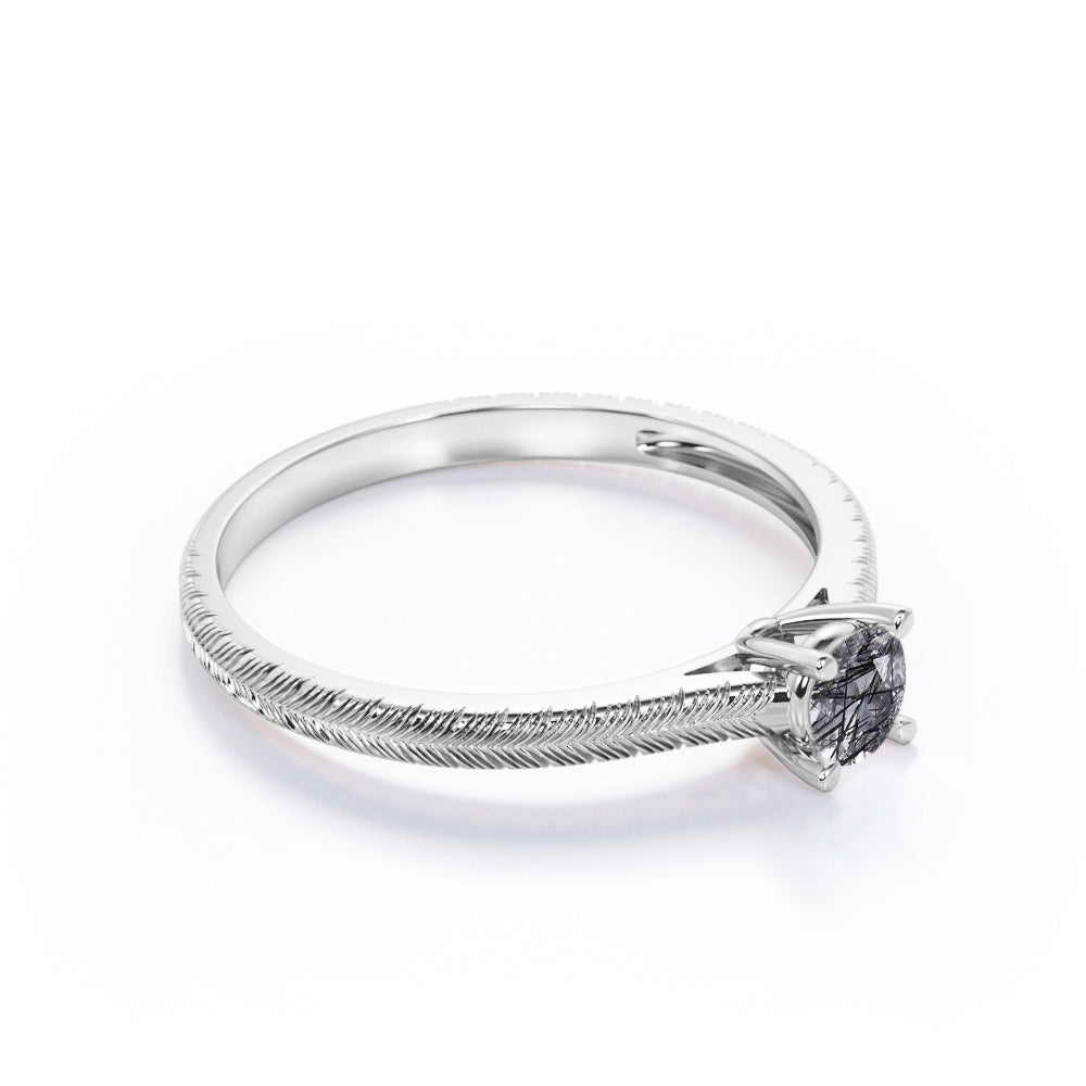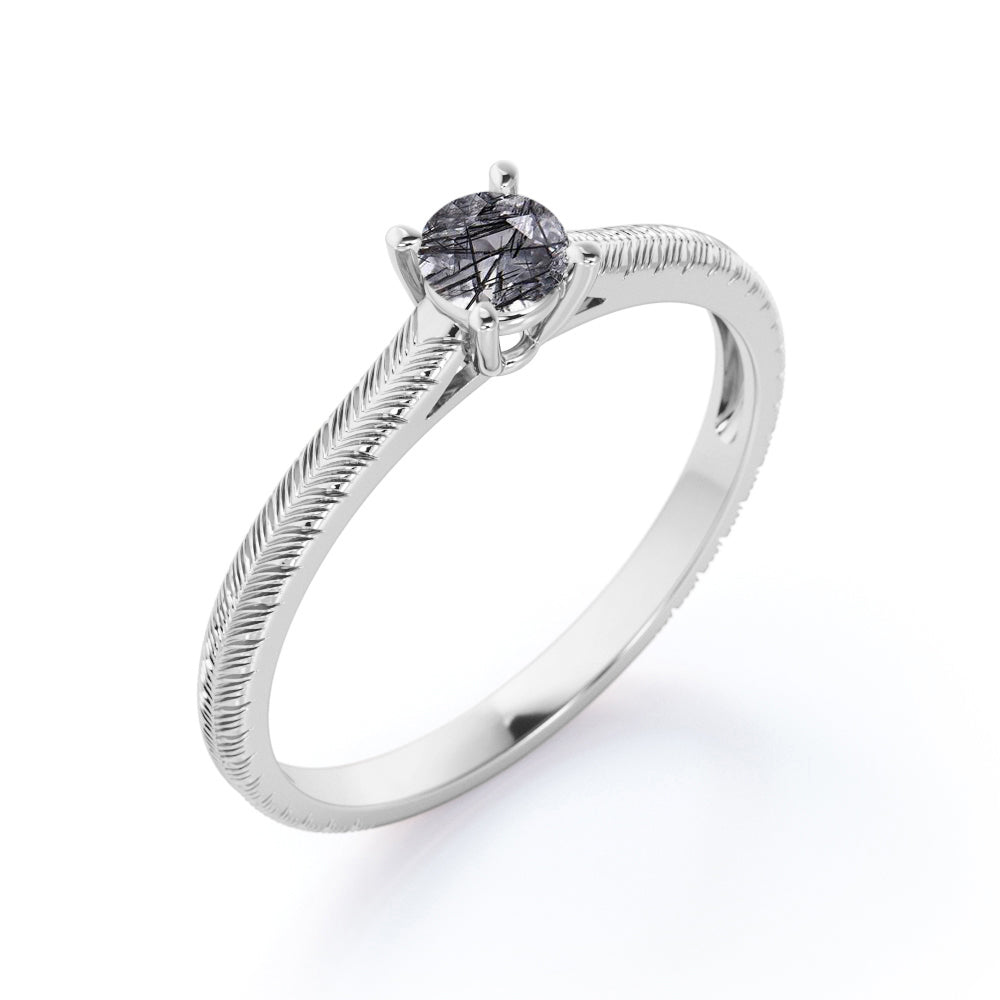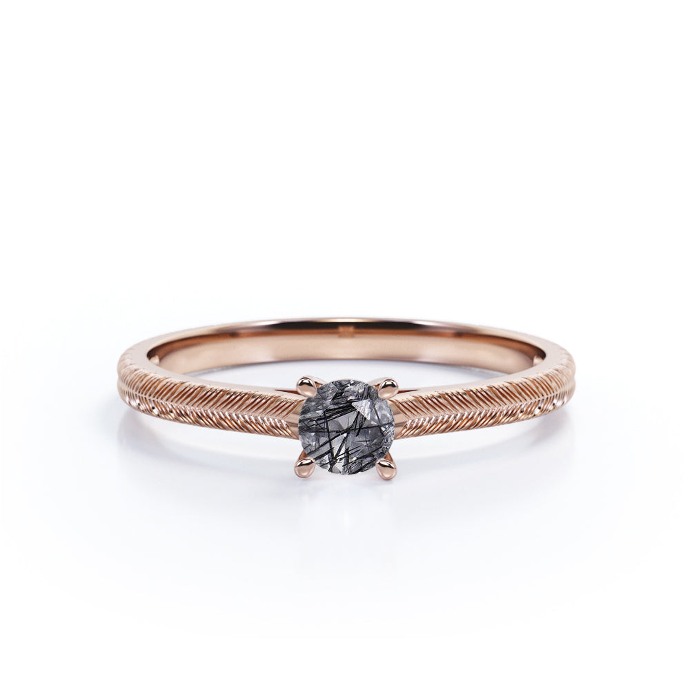 Create an incredibly beautiful look on her finger with this Classic Prong Solitaire 1.50 Carat Solid Black Rutile Clear Crystal Quartz Art Deco Engagement Ring in Rose Gold. This classic solitaire solid dendritic rutilated quartz engagement ring features 1.50 carat round cut real rutilated quartz. This simple art deco engagement ring can be customized to either 10k, 14K and Gold over Silver and either Black Gold, Rose Gold, White Gold or Yellow Gold. Also, as your satisfaction is our most priority, we will do our best to have your handmade jewelry be carefully and beautifully crafted by our expert jewelers. The order also comes with a 30-day full refund policy. This clear crystal with black needle inclusions ring will surely be a perfect gift for your significant other. It is well-known for its powerful healing properties. This tourmalinated black rutilated quartz is believed to be a protection against the ill thoughts of others. The unique dendritic black rutile within its clear quartz will surely complement every style of its wearer. Perfect for everyday wear, this solid rutilated quartz ring is resistant to chemical attack. It can be customized as per your satisfaction and available in both silver and gold metal. It perfectly fits those who are looking for a very unique ring that no two rings are alike because of its distinctive needle inclusions. Being an uplifted stone, this rutilated quartz ring infuses joy into your life and surrounding environment. Impress your special someone with this beautiful and affordable natural black hair rutilated quartz ring. It is the perfect match for those who are looking for a remarkable gemstone rings as rutilated quartz embodies their own unique intriguing patterns and uplifting meaning.
