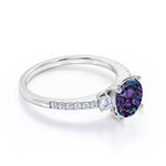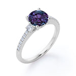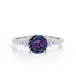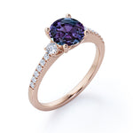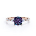 Be on cloud nine with this Classic Simple Three Stone 1.50 Carat Round Cut Lab Created Alexandrite and Diamond Half Eternity Pave Engagement Ring in Rose Gold for Women. This simple 3 stone setting lab Alexandrite engagement ring features 1 carat round cut lab created Alexandrite and .50 carat real genuine side diamond for gold ring and moissanite for silver ring. This classic Alexandrite ring can be customized to either 10k, 14K and Gold over Silver and either Black Gold, Rose Gold, White Gold or Yellow Gold. Also, as your satisfaction is our most priority, we will do our best to have your handmade jewelry be carefully and beautifully crafted by our expert jewelers. The order also comes with a 30-day full refund policy. Perfect for any occasion, this flawless artificial Alexandrite ring can be an ideal gift for anniversary, birthday, proposal, Christmas, Valentines, mother's day and more. Design your own flawless look with this created Alexandrite ring which you can customize it as per your satisfaction. This flawless man made Alexandrite ring will be a perfect fit for you love story as it is believed that joy enters the lives of people through the stone. Ornament your love story with this stunning color changing lab made Alexandrite ring inviting more happiness and joy into your marriage life. Own this lab grown Alexandrite ring which displays one of the most remarkable color changes and stand out from the rest. This flawless simulated Alexandrite ring will be a perfect match for those who are looking for beautiful, classic, vintage and antique synthetic Alexandrite pieces of fine jewelry. This ring will surely complement every style of its wearer. Design and create your very own unique ring that makes you outstanding from the rest! Impress your special someone with this beautiful and affordable lab created Alexandrite ring. It is the perfect match for those who are looking for a remarkable gemstone rings as Alexandrite embodies their own unique color-change ability and uplifting meaning.