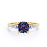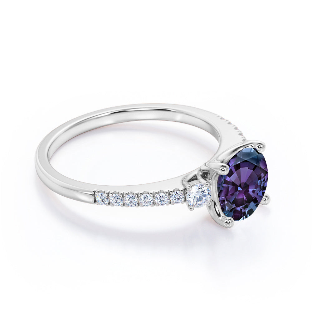 Classic Simple Three Stone 1.50 Carat Round Cut Lab Created Alexandrite and Diamond Half Eternity Pave Engagement Ring in Rose Gold for Women