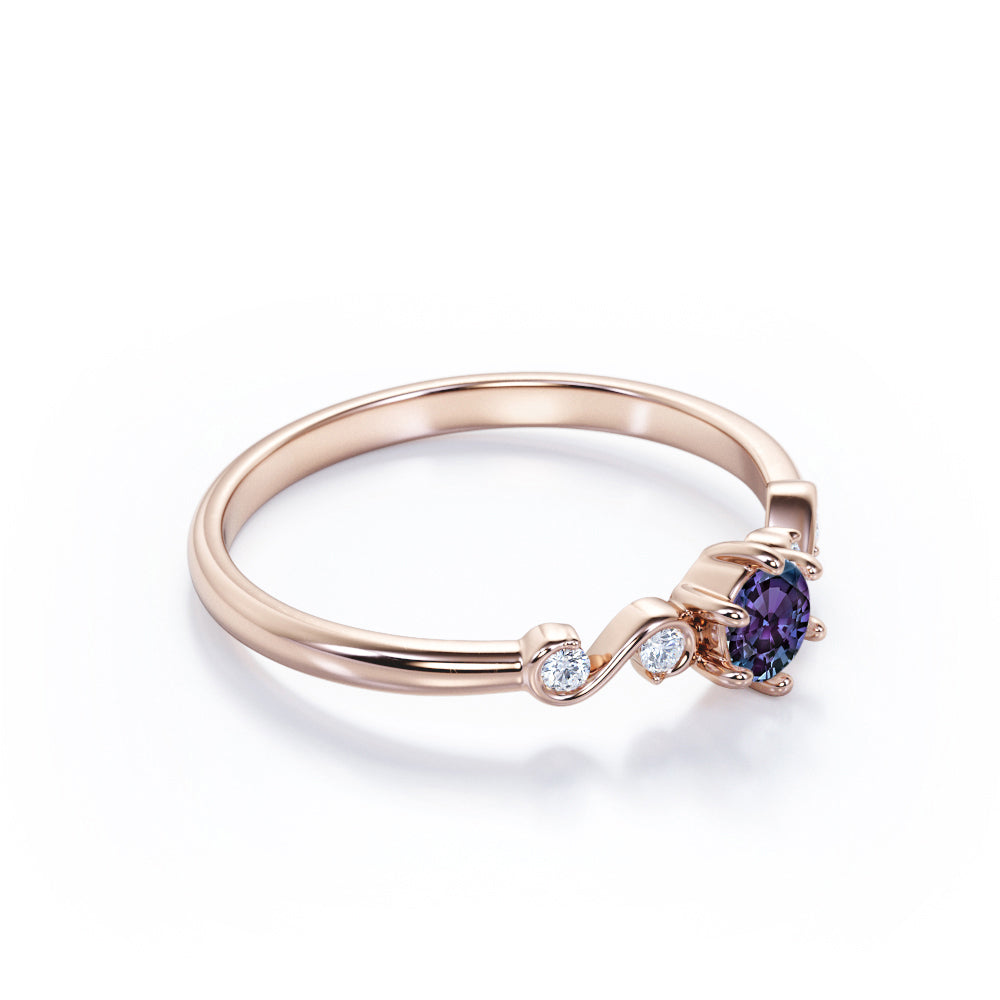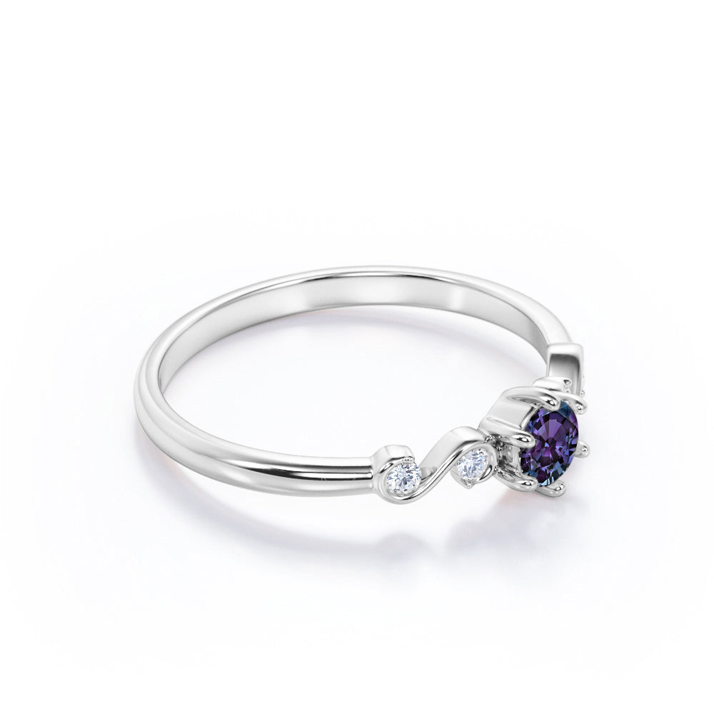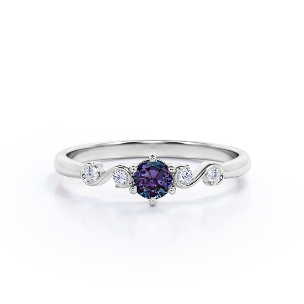 Classic Six Prong 1.10 Carat Round Cut Lab Created Alexandrite And Diamond Five Stone Engagement Ring In White Gold. Effortless and elegant, this is a piece you're bound to love forever. A captivating round shaped lab grown alexandrite of 1 carat is accompanied by two dainty round shaped 0.10 carat diamonds on either side in a white gold band. This round shaped alexandrite held in a classic six prong setting radiates simple elegance. The swirling design on the band is something very unique which adds more value to this alexandrite and diamond engagement ring. This five stone ring can also be an ideal five years anniversary gift for your loved ones. This classic six prong 1.10 carat brilliant round cut lab created alexandrite and diamond five stone engagement ring in white gold can also be customized to 18k Gold plating over silver, 10k Gold or 14k Gold as per your preference. So, wait no more, just make this statement piece the symbol of your love by clicking the add to cart button below.