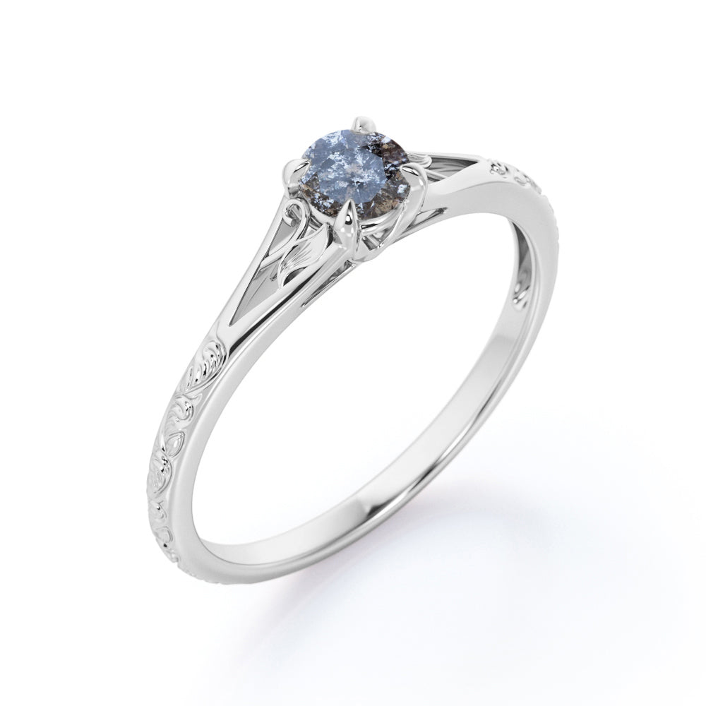 IMPORTANT NOTE: Since each Salt and Pepper Diamonds is one of a kind, the actual color of it may vary from the one that is pictured above. Embellish your love story with the uniqueness of this Classic Solitaire .50 Carat Round Cut Natural Icy Dark Grey Salt and Pepper Diamond Filigree Art Deco Engagement Ring for Women. This Milgrain decorated icy grey Salt and Pepper Diamond ring features .50 carat round cut natural Salt and Pepper Diamond. This simple Salt and Pepper engagement ring can be customized to either 10k, 14K and Gold over Silver and either Black Gold, Rose Gold, White Gold or Yellow Gold. Also, as your satisfaction is our most priority, we will do our best to have your handmade jewelry be carefully and beautifully crafted by our expert jewelers. The order also comes with a 30-day full refund policy. Perfect for any occasion, this flawless natural Salt and Pepper Diamond ring can be an ideal gift for anniversary, birthday, proposal, Christmas, Valentines, mother's day and more. With its unique appearance, this unique dark grey Salt and Pepper Diamond ring will create a charming and fascinating look on your fingers. The quirky looks of Salt and Pepper Diamond helps couples to match their unique love story. If you are searching for some alternate gemstone with unique appearance, this Salt and Pepper Diamond ring will be your right choice. Salt and Pepper Diamonds provide an ideal way to stand out from crowd with a gorgeous and distinctive ring. Create a fascinating look on your finger with this Salt and Pepper Diamond ring for women which is available in both solid gold and sterling silver. Diversity of Salt and Pepper Diamond provides additional character to your traditional engagement ring. Being considered a very eccentric gemstone, Salt and Pepper Diamond will create a timeless and fabulous engagement ring. Those who has a penchant for vintage and flawless ring would completely fall in love with this affordable ring. Handcrafted with love, this antique ring will complement any style and enhance the charm of its wearer.