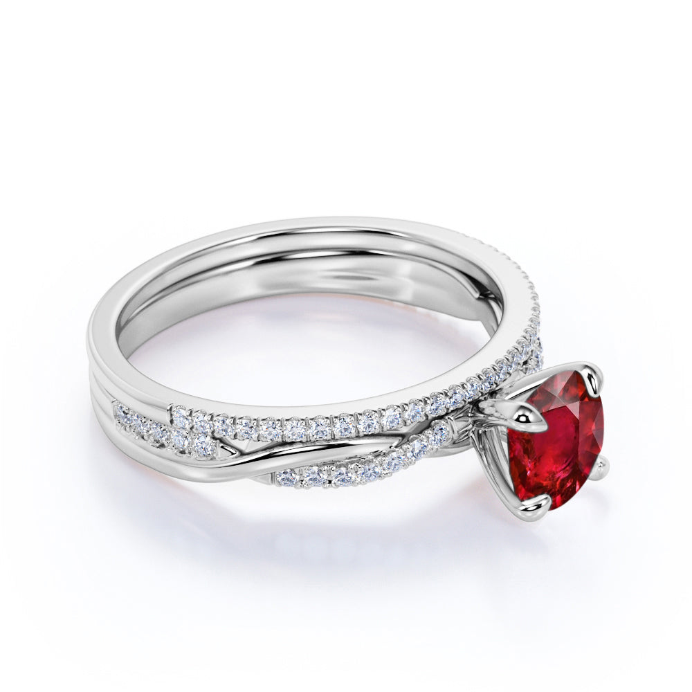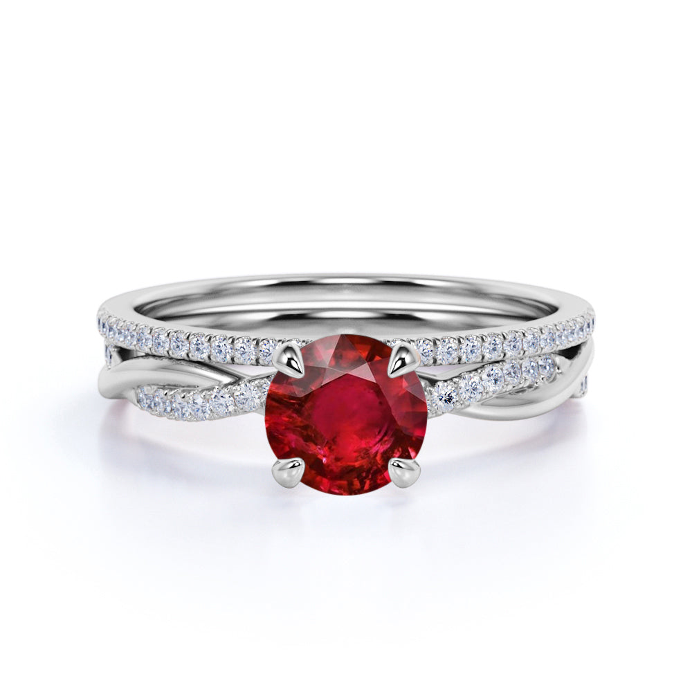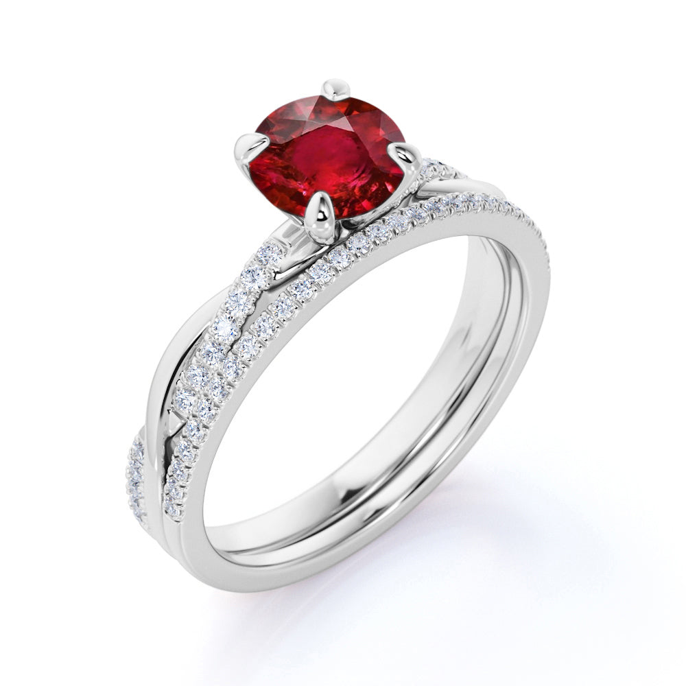 Classic Infinity 1.50 Carat Round Cut Lab Ruby and Diamond Pave Wedding Ring Set in White Gold