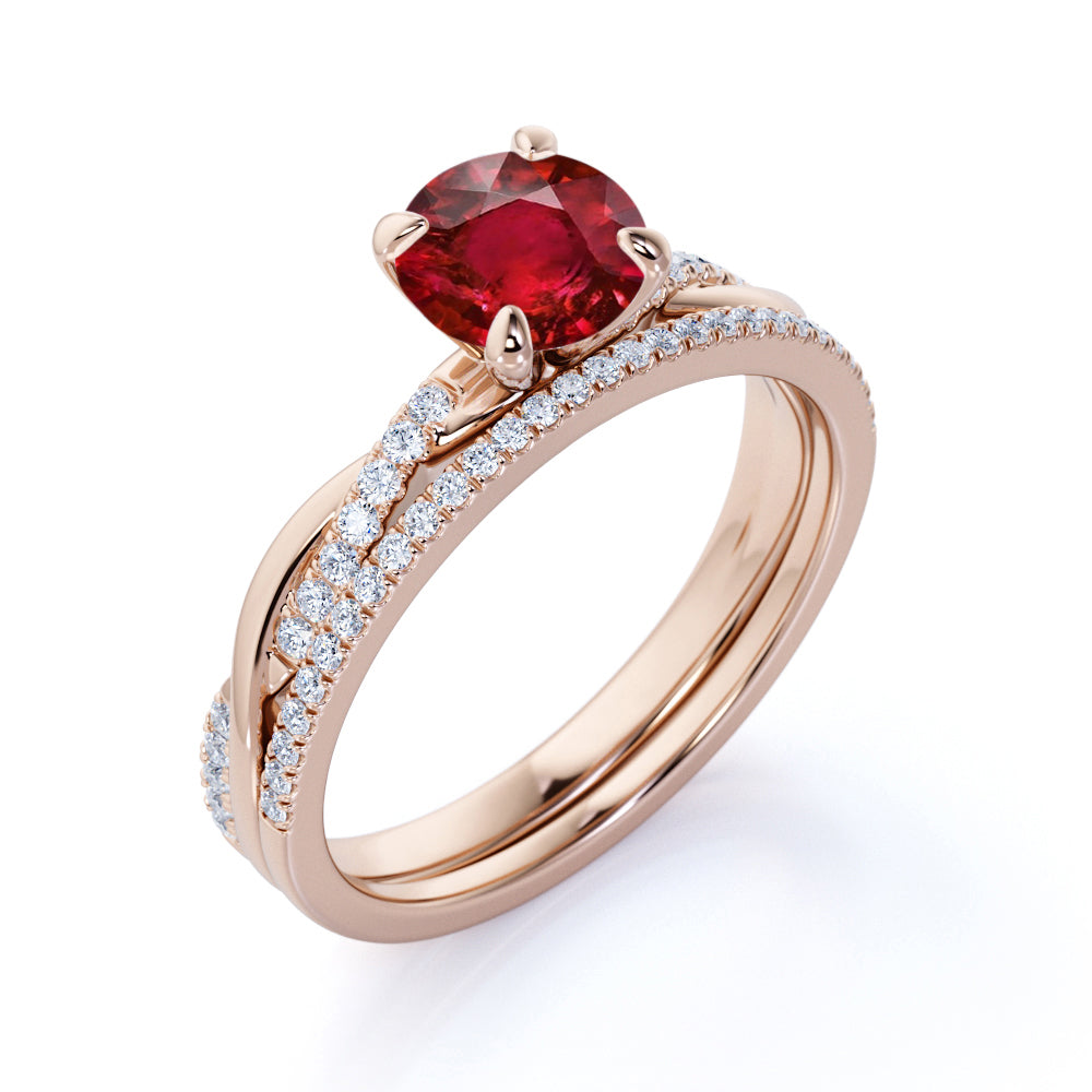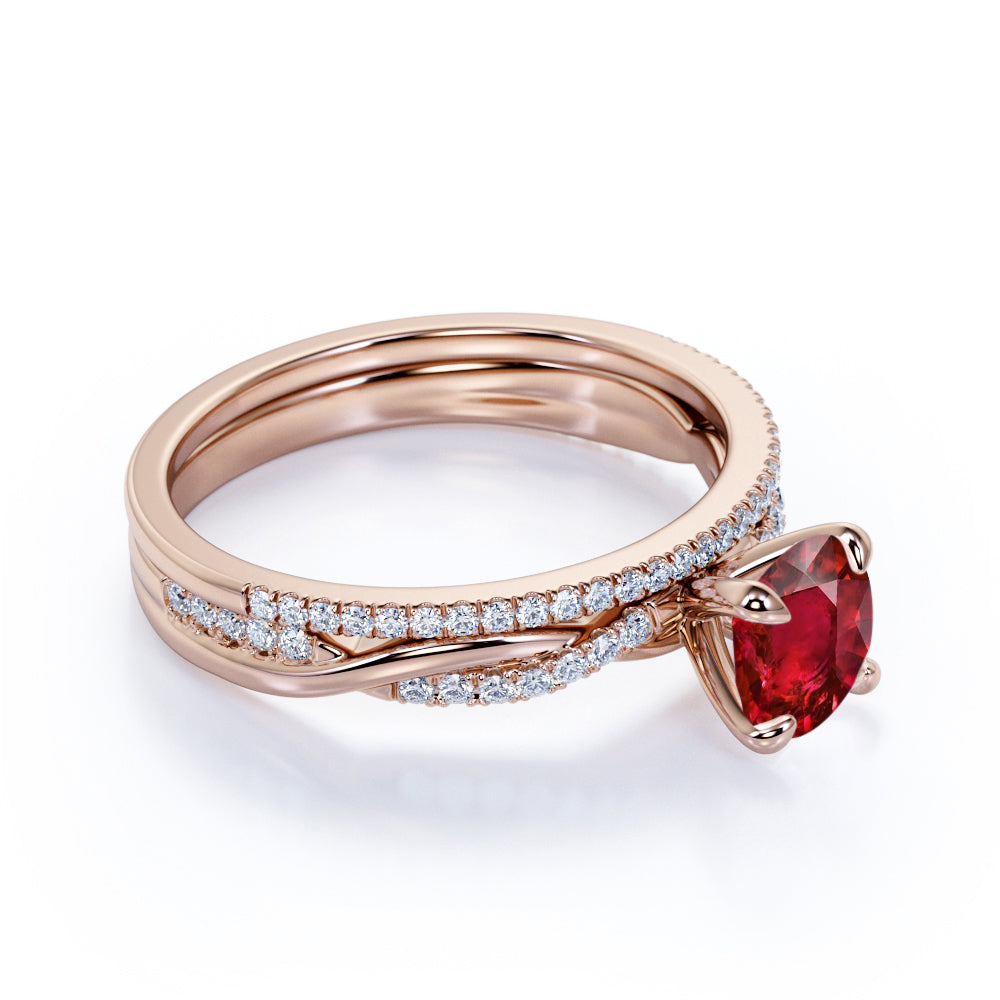 This is a beautiful 1.50 Carat Round Cut Lab Ruby and Diamond Pave Wedding Ring Set in White Gold. The classic infinity design wedding ring set is made with Lab Ruby, diamonds and on gold. The Lab Ruby bridal set ring can be made in either Rose, White or Yellow Gold, and can be customized to your choice of 10k, 14k or 18k Gold. As always, the order comes with jewelry certificate, 6 month limited warranty and 30 days full refund policy. Although each ring is handmade and customized to your specifications, we guarantee that once you placed your order, we will make and deliver it to you within 5 business days.