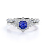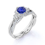 This is a beautiful floral halo cluster 2 Carat Round Cut Sapphire and Diamond Bridal Set with Infinity Band in White Gold. The vintage flower design bridal set is made with natural sapphire, real diamonds and on real gold. The sapphire bridal set can be made in either Rose, White or Yellow Gold, and can be customized to your choice of 10k, 14k or 18k Gold. As always, the order comes with jewelry certificate, 6 month limited warranty and 30 days full refund policy. Although each ring is handmade and customized to your specifications, we guarantee that once you placed your order, we will make and deliver it to you within 5 business days.