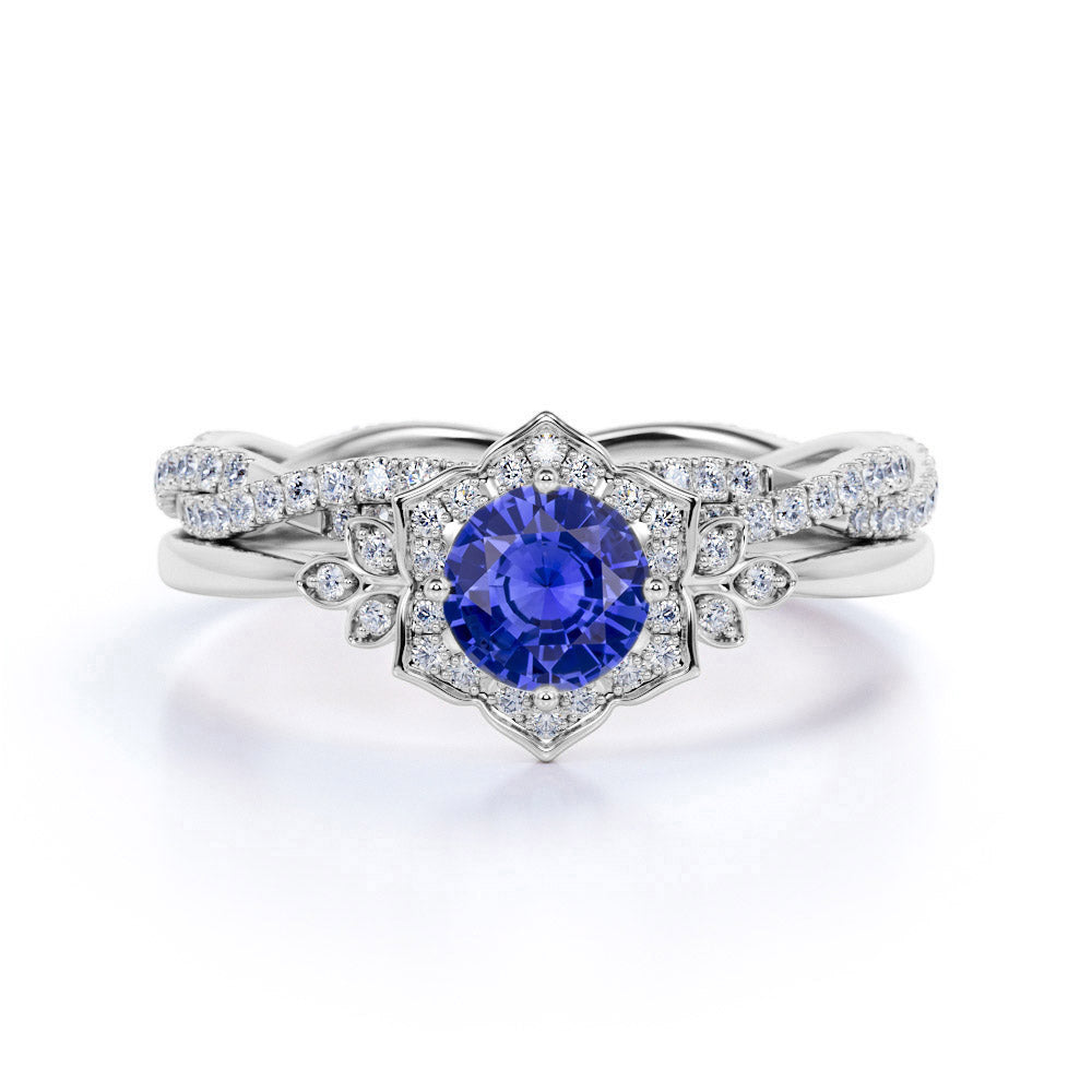 Vintage Floral Halo Cluster 2 Carat Round Cut Sapphire and Diamond Bridal Set with Infinity Band in White Gold
