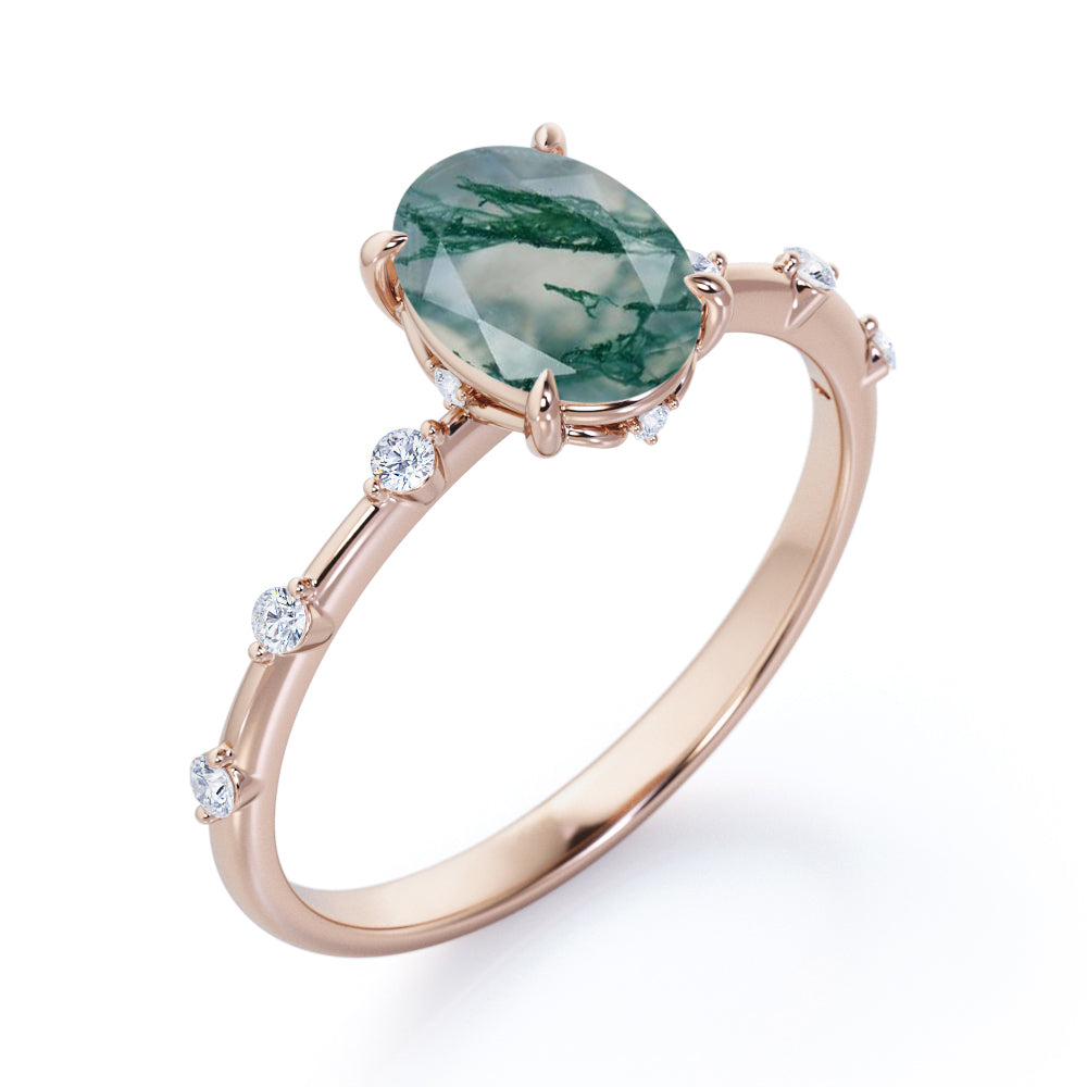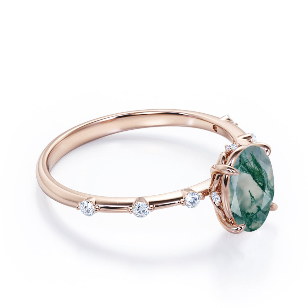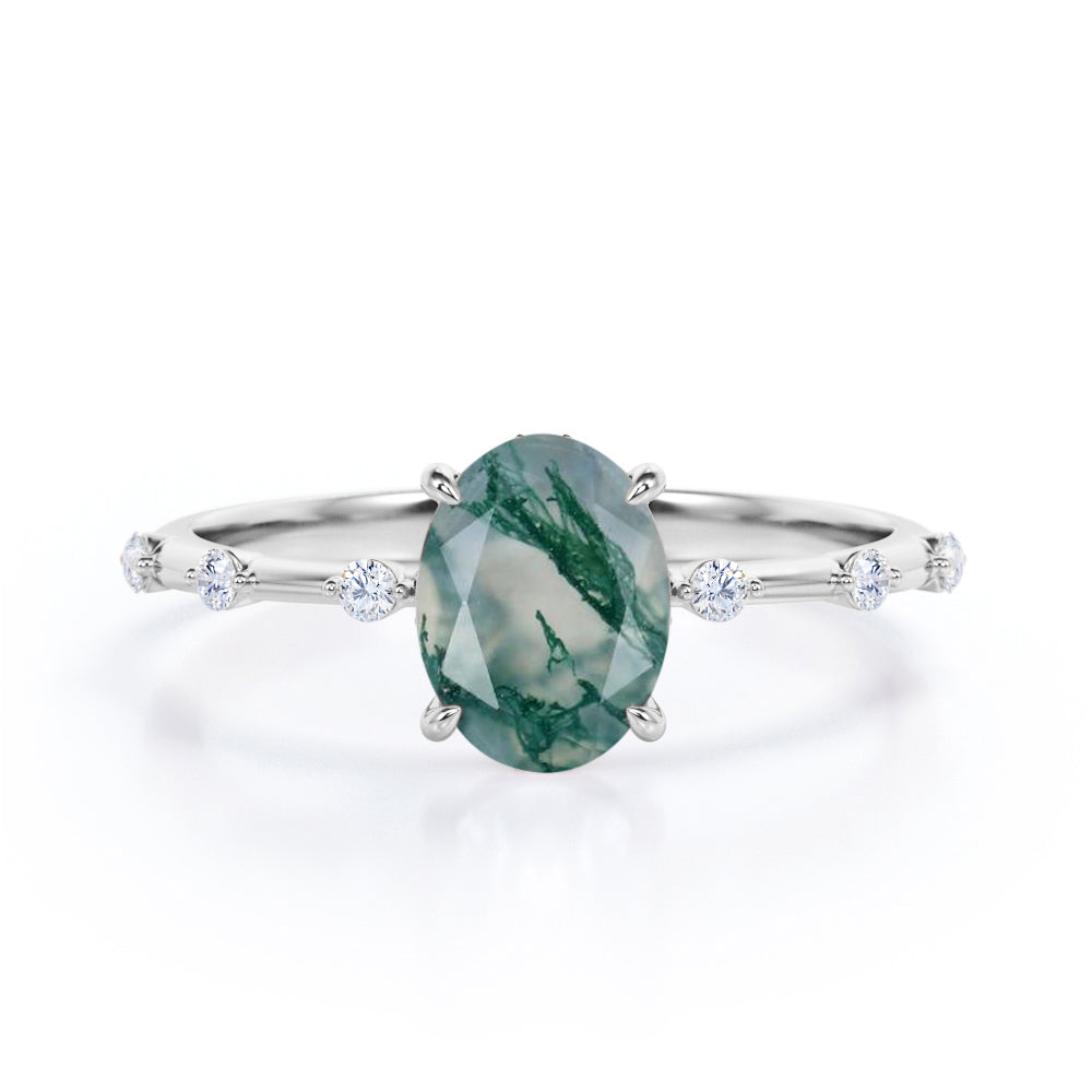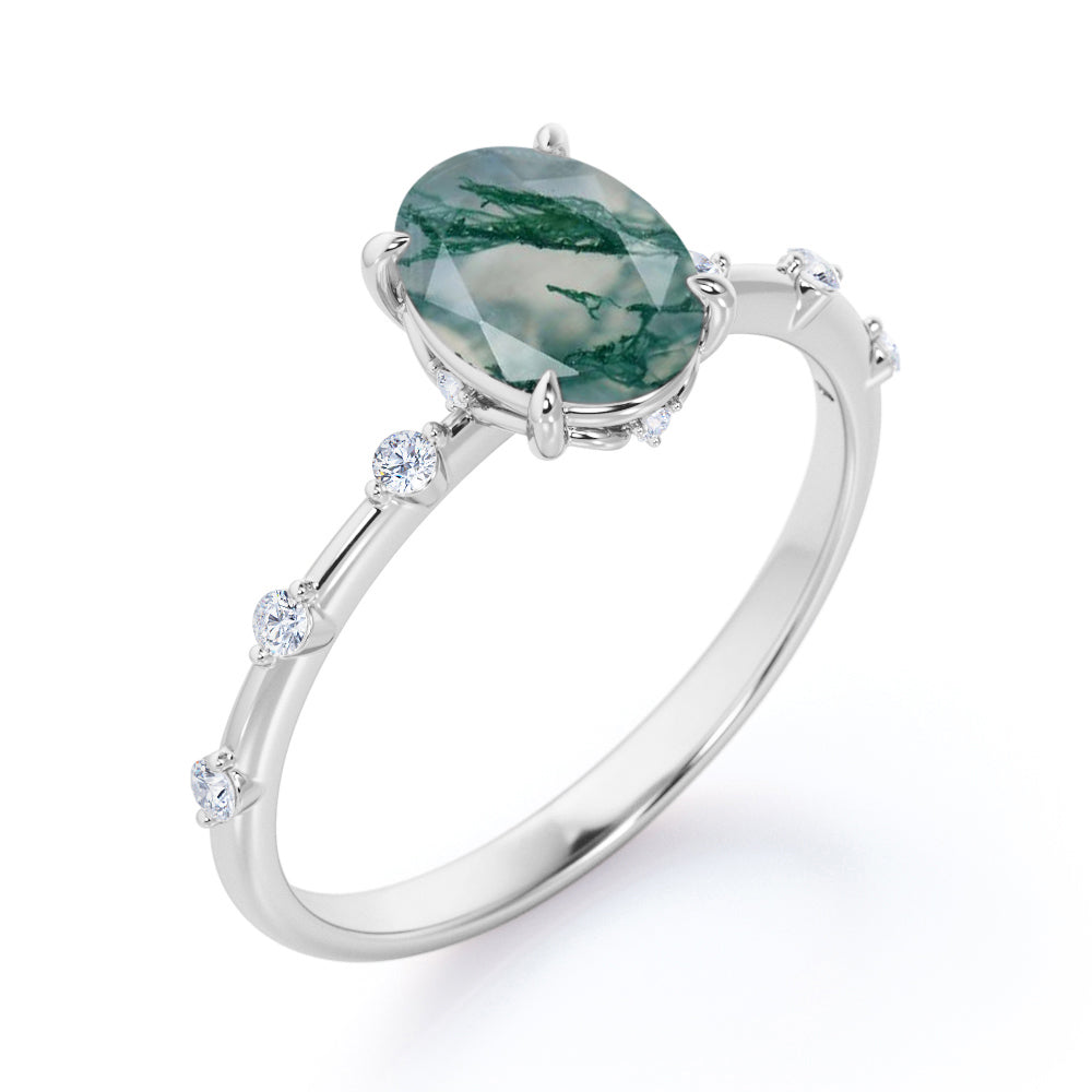 Tapered 0.6 Ct Oval Green Moss Agate Engagement Ring