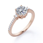 Shimmer your total look with the Classic Three Stone 1.20 carat Round Moissanite and Diamond Engagement Ring in Rose Gold. The ring showcases a 1 carat round Moissanite in the basket setting and decorated by round smaller Moissanite while the band is garnished with even smaller round Moissanite. This promise ring is very simple and classic which is why it can be paired with any fine jewelry in your special occasion like Anniversary, Birthday or New year party. The ring can be made in 18k gold over silver, 10k gold, 14k gold with the color of white gold, rose gold, yellow gold, black gold.