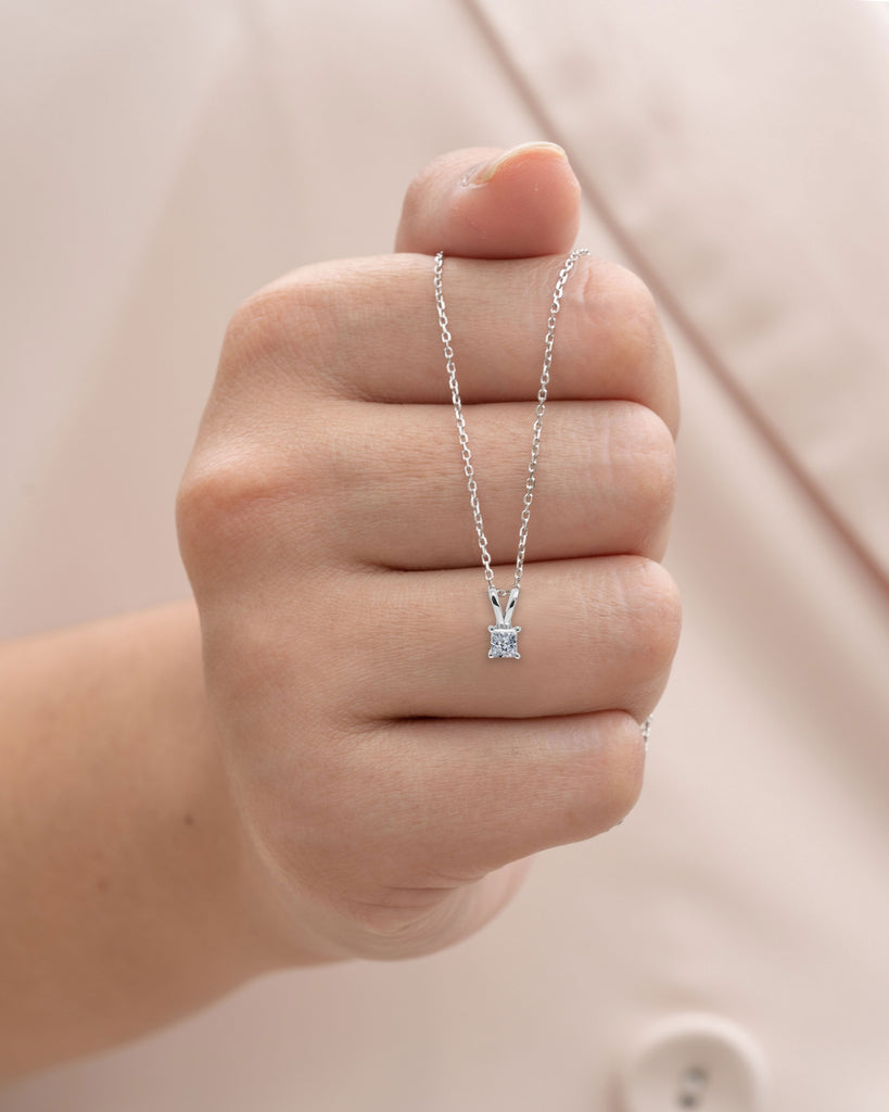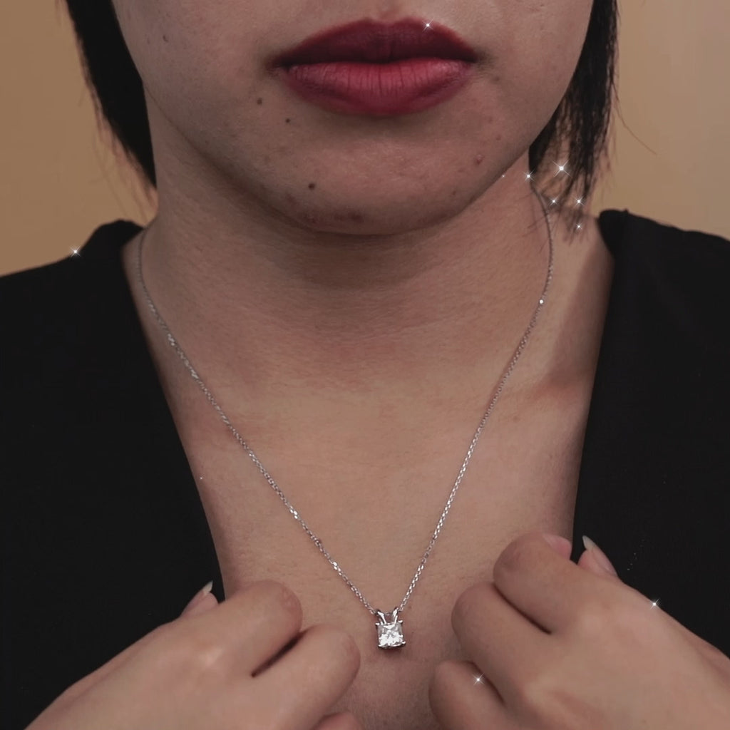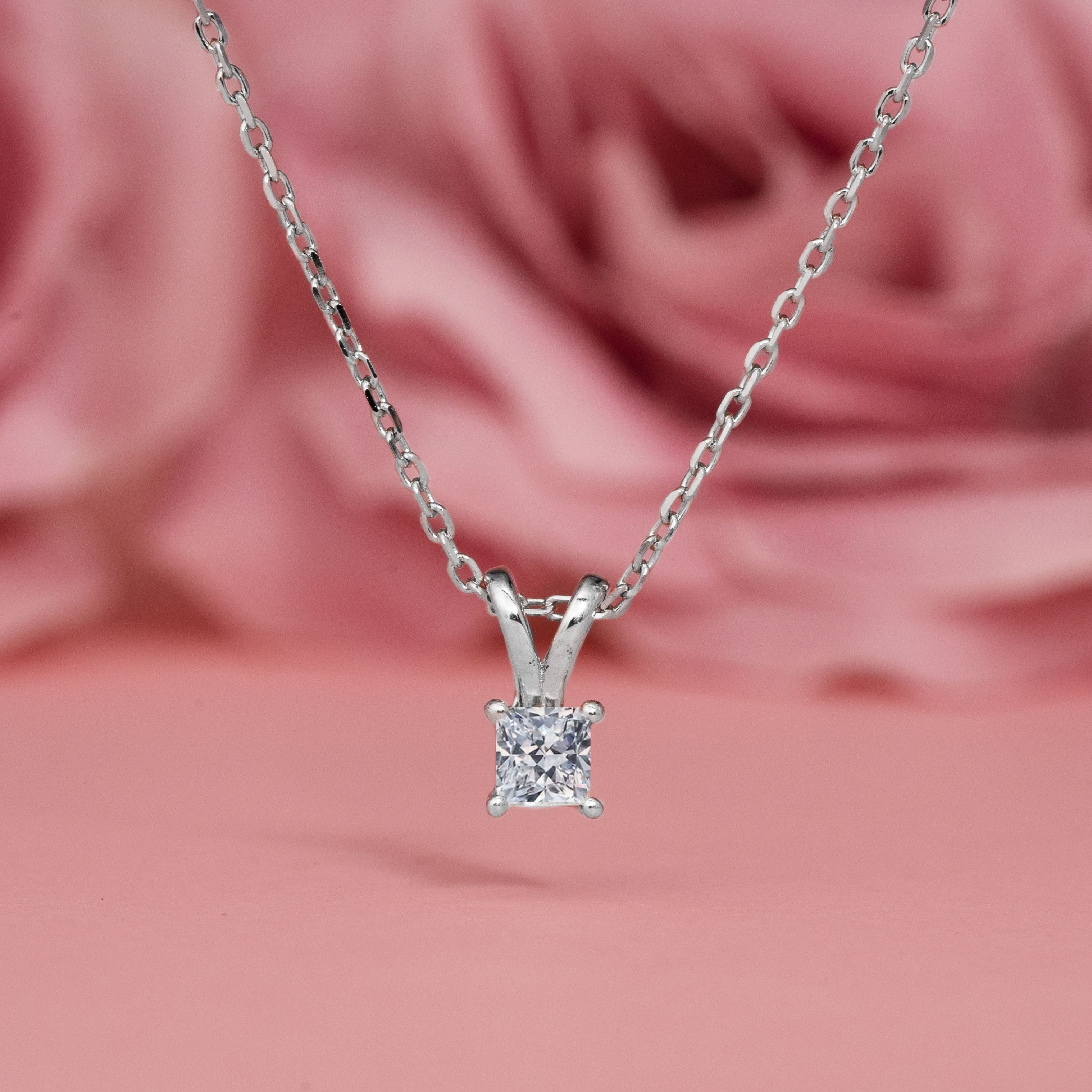 Claw Set Solitaire 1 Carat Princess Cut Certified Moissanite Double Bail Pendant Necklace in White Gold