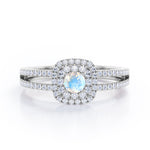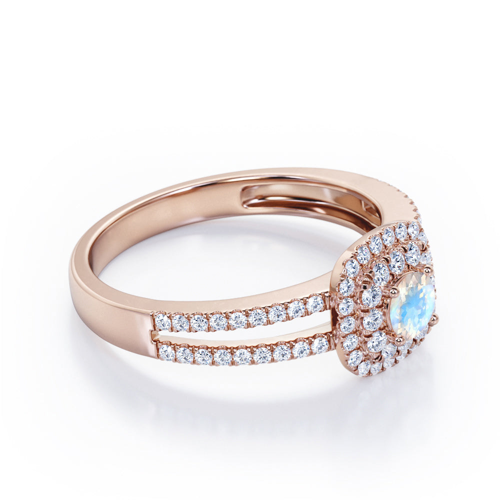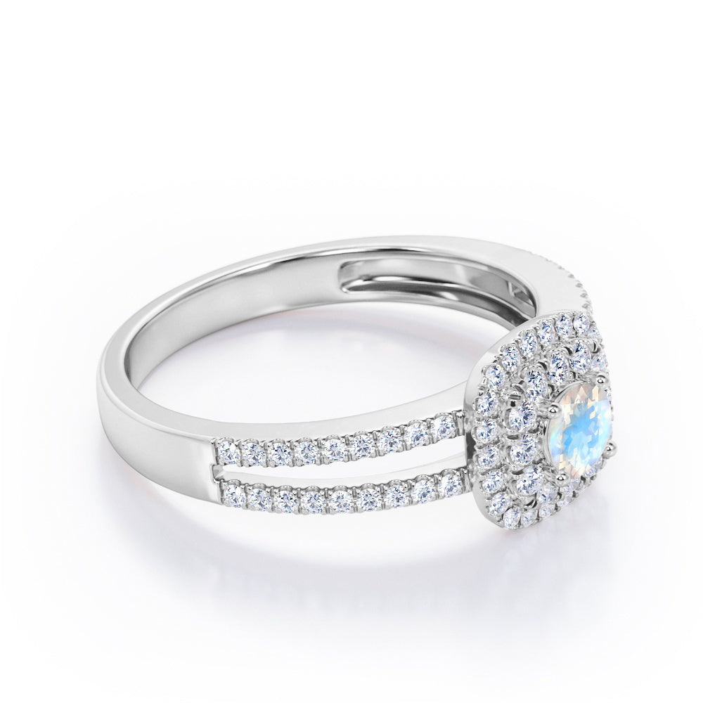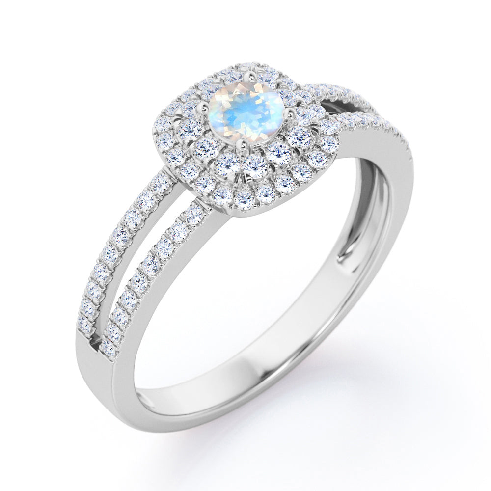 Clustered 1.55 Carat Round Cut Moonstone And Diamond Double Halo Split Shank Engagement Ring In White Gold. An easy way to put a modern spin on a traditional engagement ring is to play with the stone's symmetry. This brilliant round cut moonstone engagement ring features a 1 carat luscious moonstone center stone in a double halo setting surrounded by 0.55 carat white diamonds which illuminates great brilliance and wonderful sparkle. An impressive and sparkling cushion framed double halo surrounds the center stone for a ring that will definitely stand out. The split shank in white gold band features pavé diamonds halfway around which adds more charm and value to this mesmerizing engagement ring. Handmade by our well-experienced artisans, this clustered 1.55 carat round cut moonstone and diamond double halo split shank engagement ring can also be customized to 18k Gold plating over silver, 10k Gold or 14k Gold as per your preference. Please note that if the ring is made over silver, the side stone will be moissanite and if it is made on gold, diamond will be employed as the side stone.