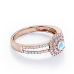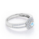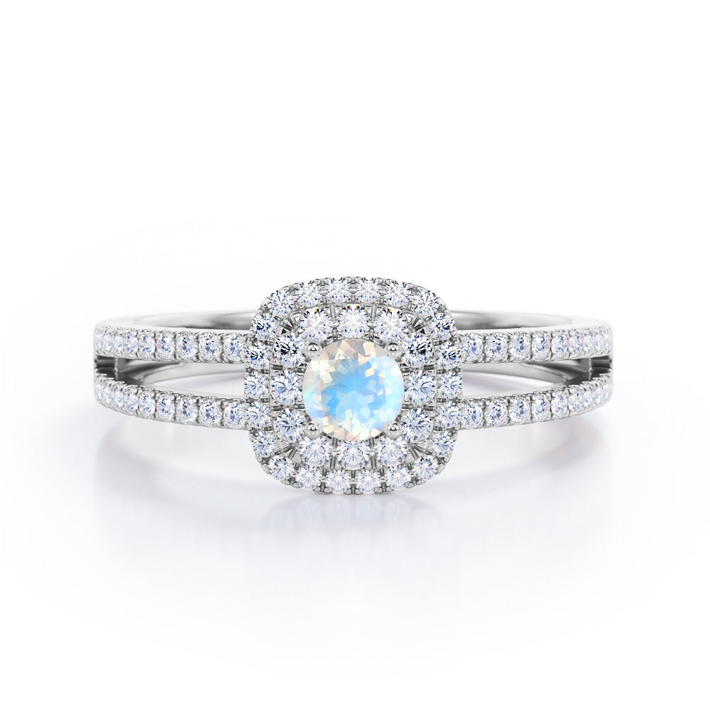 Clustered 1.55 Carat Round Cut Moonstone And Diamond Double Halo Split Shank Engagement Ring In White Gold