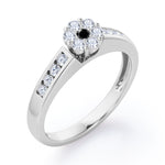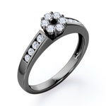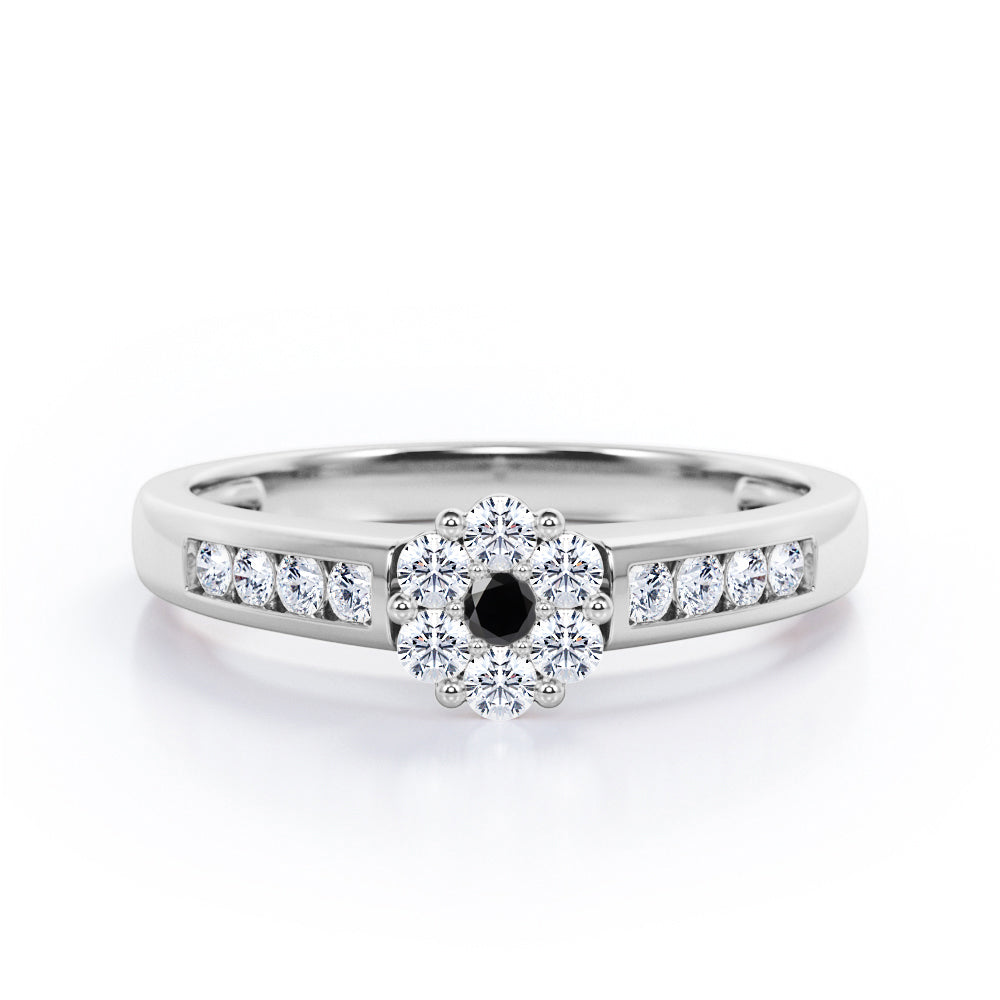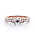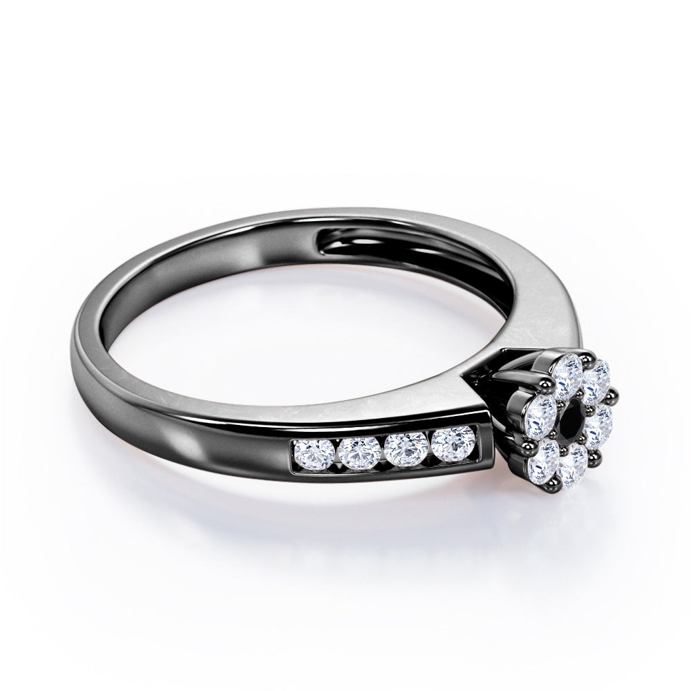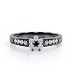 Dainty round band with dainty round Moissanite is something to be adored. This Clustered 1 carat Round Petite Black diamonds Channel Engagement Ring in White Gold displays small round Black diamond at the center, forming together like a fluffy flower. The band also possesses some sparkle as four Moissanite stones are featured in channel setting on each side of the band. This classic design ring can be an alternative choice to diamond engagement ring as they look almost the same. You can choose either 18k gold over silver, 10k gold or 14k gold to be the metal of your ring with white gold, rose gold, yellow gold and black gold.