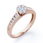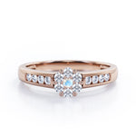 Dainty round band with dainty round Moissanite is something to be adored. This Clustered 1 carat Round Petite Moissanite and Diamonds Channel Engagement Ring in White Gold displays small round Moonstone at the center, forming together like a fluffy flower. The band also possesses some sparkle as four Moissanite stones are featured in channel setting on each side of the band. This classic design ring can be an alternative choice to diamond engagement ring as they look almost the same. You can choose either 18k gold over silver, 10k gold or 14k gold to be the metal of your ring with white gold, rose gold, yellow gold and black gold.