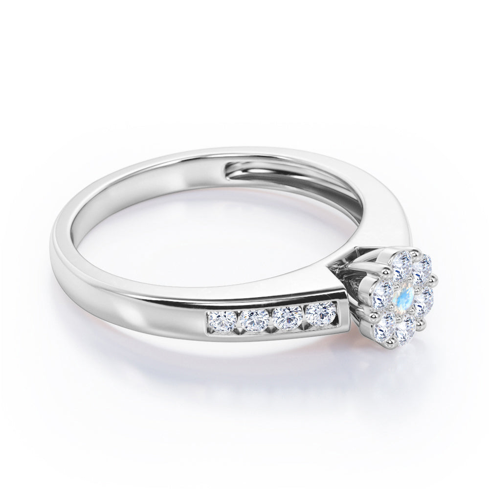 Clustered 1 carat Round Petite Moonstone and Moissanites Channel Engagement Ring in White Gold