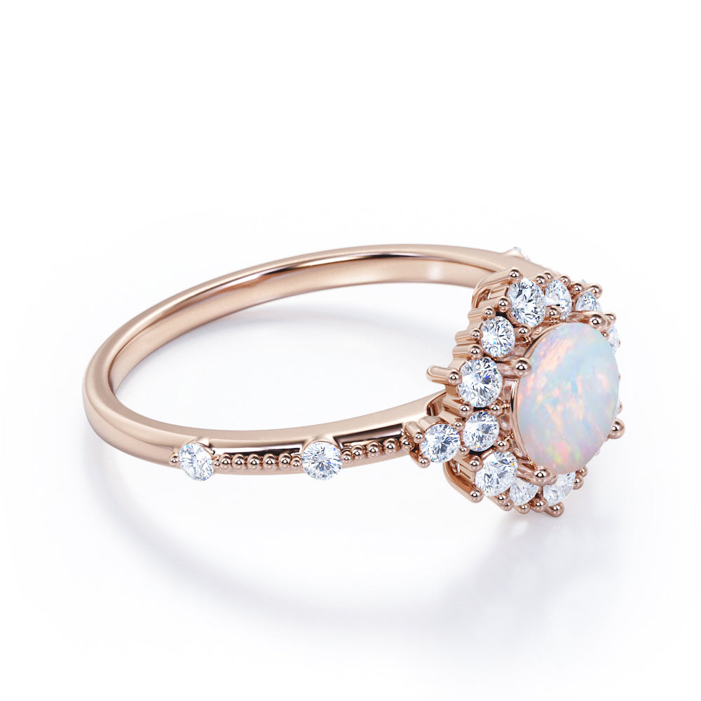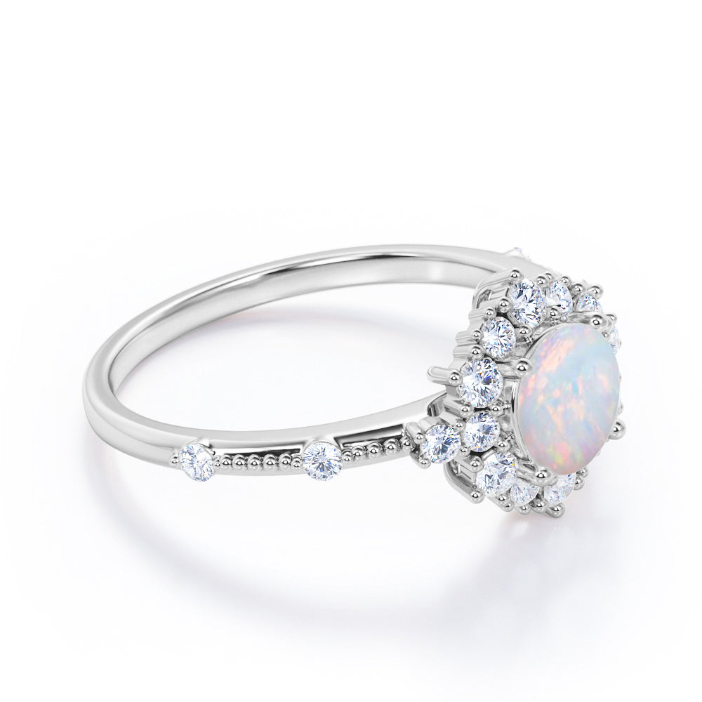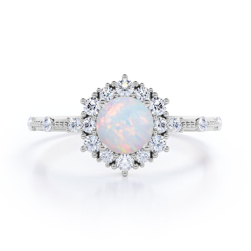 Clustered Halo 1.30 Carat Round Cut Translucent Opal And Diamond Antique Beaded Engagement Ring In White Gold