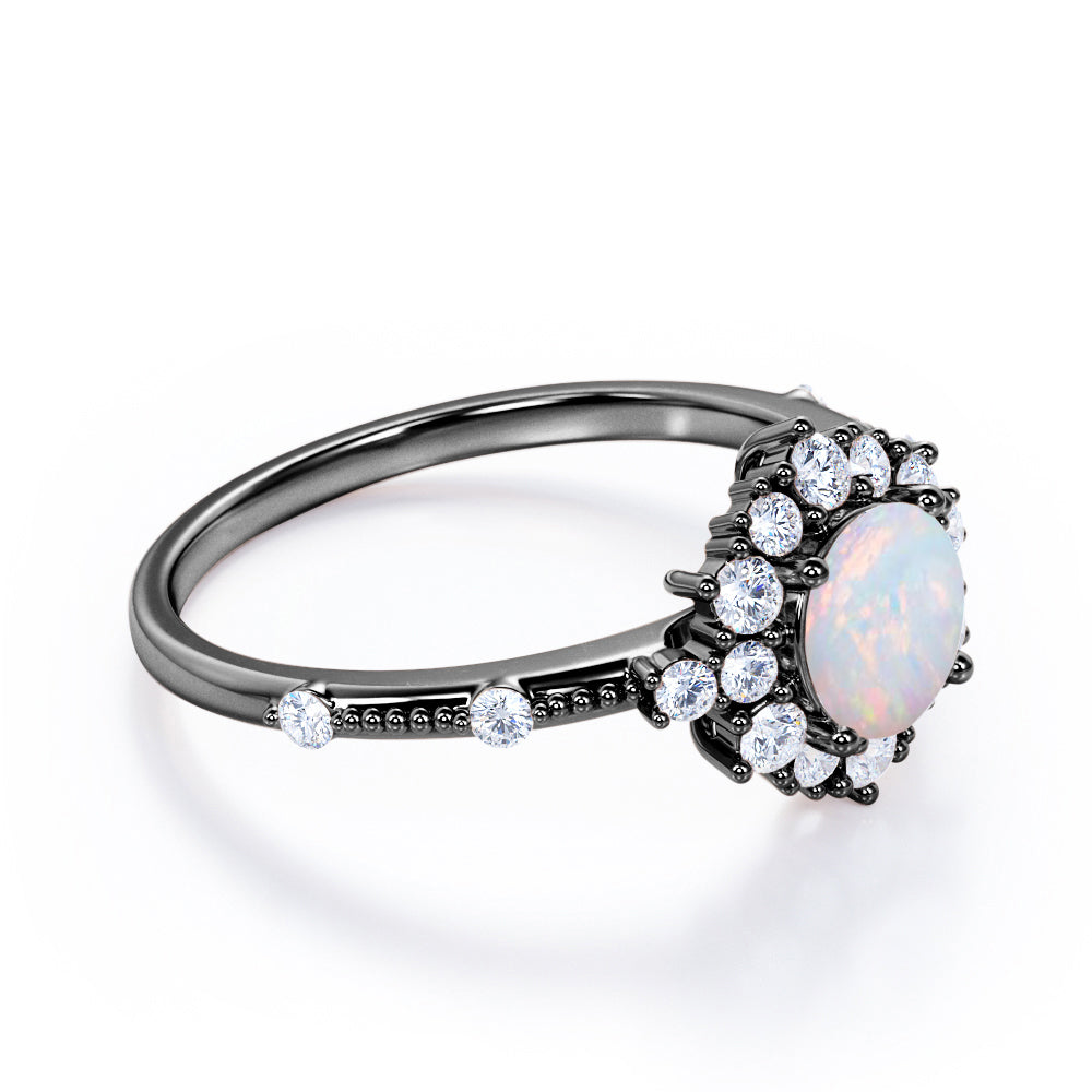 Clustered Halo 1.30 Carat Round Cut Translucent Opal And Diamond Antique Beaded Engagement Ring In White Gold. A sweet cluster opal engagement ring to take on any symbolism that resonates with you. The blaze of this cool-toned gem is absolutely electrifying. A single opal center stone emanates a celestial aura amongst a bed of starry diamonds. This vintage ring features one carat brilliant round cut opal as the center stone which sits in a cluster halo of sizzling diamonds weighing 0.30 carat inclusive of the band in white gold. The beaded and diamond work on the band is highly commendable work of our craftsmen which adds that antique vibes on this engagement ring. This clustered halo 1.30 carat round cut translucent opal and diamond antique beaded engagement ring in white gold can also be customized to 18k Gold plating over silver, 10k Gold or 14k Gold as per your preference. A glimmering cluster style with a vintage flair, this ring is a statement piece.