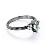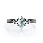 Clustered Triangle 1 carat Natural Moss Agate and Moissanite Engagement Ring in White Gold displays 0.85 carat kite shape natural Moss agate and connected with 3 round Moissanite on each side. The trilogy stones are formed into a 0.15 carat shape of triangle and synchronized with the kite shape in the middle. Inclusions of the Moss agate make the ring unique and it goes well with the chic style of this alternative ring. Not only the ring is fashionable, Moss agate is believed to be a healing stone; it replaces any bad forces with a positive energy and it also bring you luck. It could be a perfect choice for your bride to be or whomever you care for. The ring comes at a very affordable price and it is available in white gold, rose gold, yellow gold and black gold with 3 metal options; 18k gold over silver, 10k gold, and 14k gold.