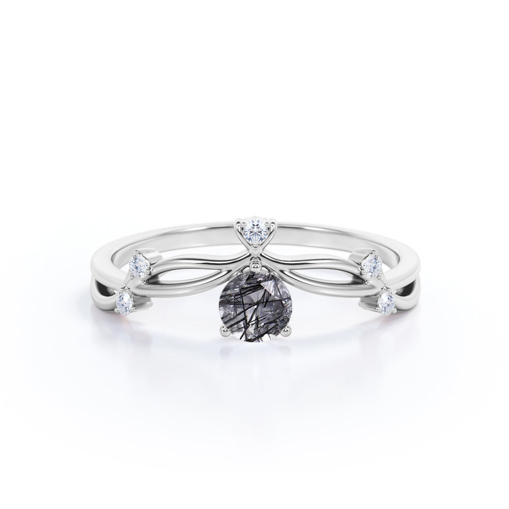 This Contour Solitaire 0.60 Carat Round Cut Smokey Black Needles Rutilated Quartz and Diamond Modern Engagement Ring offers a very quirky and unique look on her finger. This minimalist ring features .50 carat round cut black rutilated quartz and .10 carat real side diamond for gold ring and moissanite for silver ring, for a total 0.60 carat. It can be customized to either 10k, 14K and Gold over Silver and either Black Gold, Rose Gold, White Gold or Yellow Gold. Also, as your satisfaction is our most priority, we will do our best to have your handmade jewelry be carefully and beautifully crafted by our expert jewelers. The order also comes with a 30-day full refund policy. If you are looking for some unique rings, this natural black hair rutilated quartz ring is perfect for you. It is well-known for its powerful healing properties. Rutilated Quartz is believed to help wearer get to the core of the problems by promoting determination to face the truth. Due to its unique clear quartz with druzy black inclusions, this vintage rutilated quartz ring is sure to enchant its wearer. Perfect for everyday wear, this solid rutilated quartz ring is resistant to chemical attack. This ring is available at a very affordable price and available in both silver and gold ring. Precisely handcrafted and created to be unique, no two rings are exactly alike because of its unique pattern of needle inclusions. Crowned as a powerful heeling stone, this rutilated quartz ring enhances will-power and determination of its wearer. Impress your special someone with this beautiful and affordable natural black hair rutilated quartz ring. With its mesmerizing patters of colors and inclusions, this rutilated quartz ring will enchant your special someone with gracefulness.