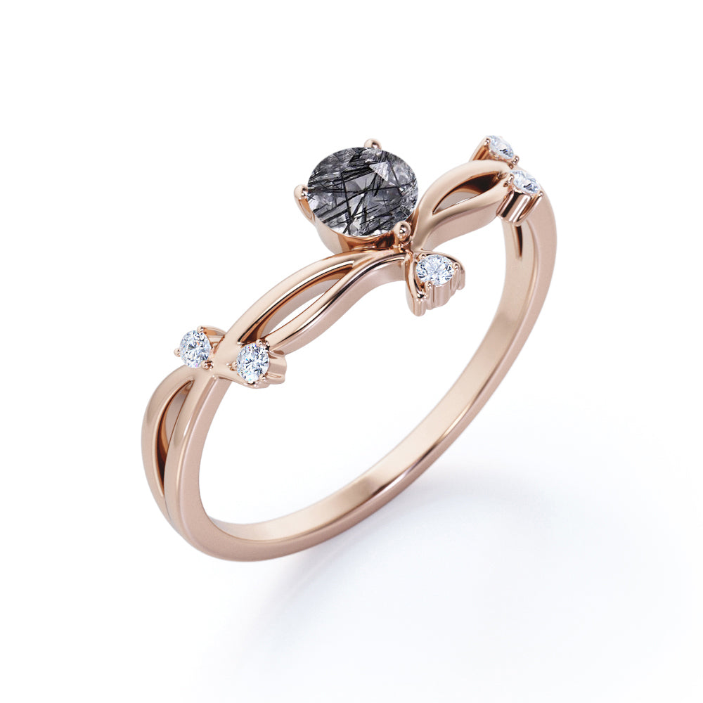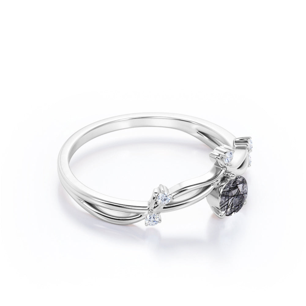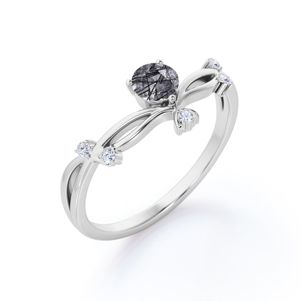 Contour Solitaire 0.60 Carat Round Cut Smokey Black Needles Rutilated Quartz and Diamond Modern Engagement Ring