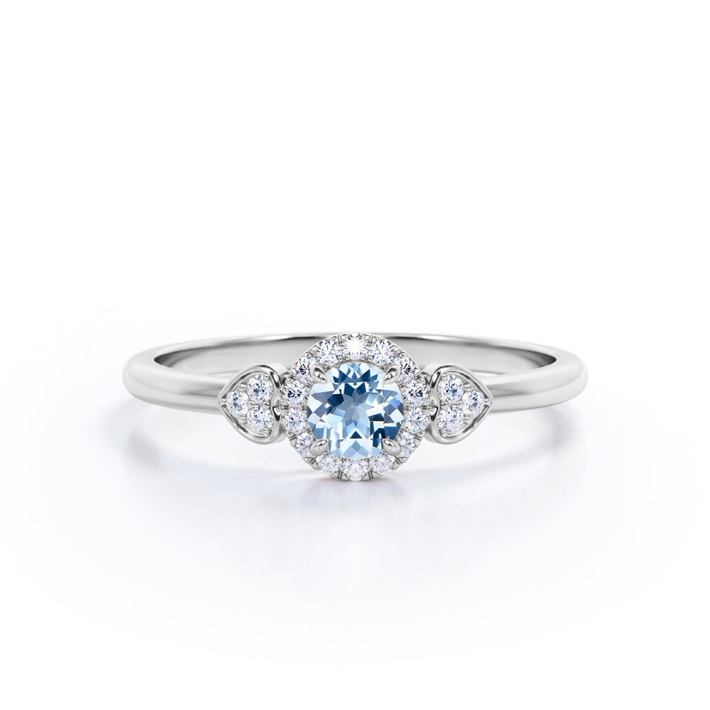 Double hearts 1.15 Carat Round Cut Aquamarine And Diamond Halo Engagement Ring In White Gold. Express your love with this gorgeous halo promise ring. This lovely ring highlights a very fine blue aquamarine center stone surrounded by paved diamonds in a halo setting that is truly fascinating. Each side of the ring also highlights a very charming heart-shaped style with a paved diamond inside it that creates a very sophisticated look to this ring. Handcrafted with passion, this elegant promise ring features a 1 carat very fine round blue aquamarine, surrounded by, 0.15 carat dazzling diamond side stones for the gold rings and moissanite for the silver rings that weigh a total of 1.15 carat. Gorgeous in white gold, this charming engagement ring is also available in rose gold, yellow gold, and black gold. Also, it can be made between 18k gold over silver, 10k gold, and 14k gold depending on your preferred customization. Please kindly note for the silver ring option that silver is a very sensitive metal, any chemicals like hand creams, lotion, or sanitizers. etc., can affect the plating.