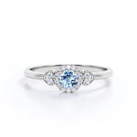 Double hearts 1.15 Carat Round Cut Aquamarine And Diamond Halo Engagement Ring In White Gold. Express your love with this gorgeous halo promise ring. This lovely ring highlights a very fine blue aquamarine center stone surrounded by paved diamonds in a halo setting that is truly fascinating. Each side of the ring also highlights a very charming heart-shaped style with a paved diamond inside it that creates a very sophisticated look to this ring. Handcrafted with passion, this elegant promise ring features a 1 carat very fine round blue aquamarine, surrounded by, 0.15 carat dazzling diamond side stones for the gold rings and moissanite for the silver rings that weigh a total of 1.15 carat. Gorgeous in white gold, this charming engagement ring is also available in rose gold, yellow gold, and black gold. Also, it can be made between 18k gold over silver, 10k gold, and 14k gold depending on your preferred customization. Please kindly note for the silver ring option that silver is a very sensitive metal, any chemicals like hand creams, lotion, or sanitizers. etc., can affect the plating.