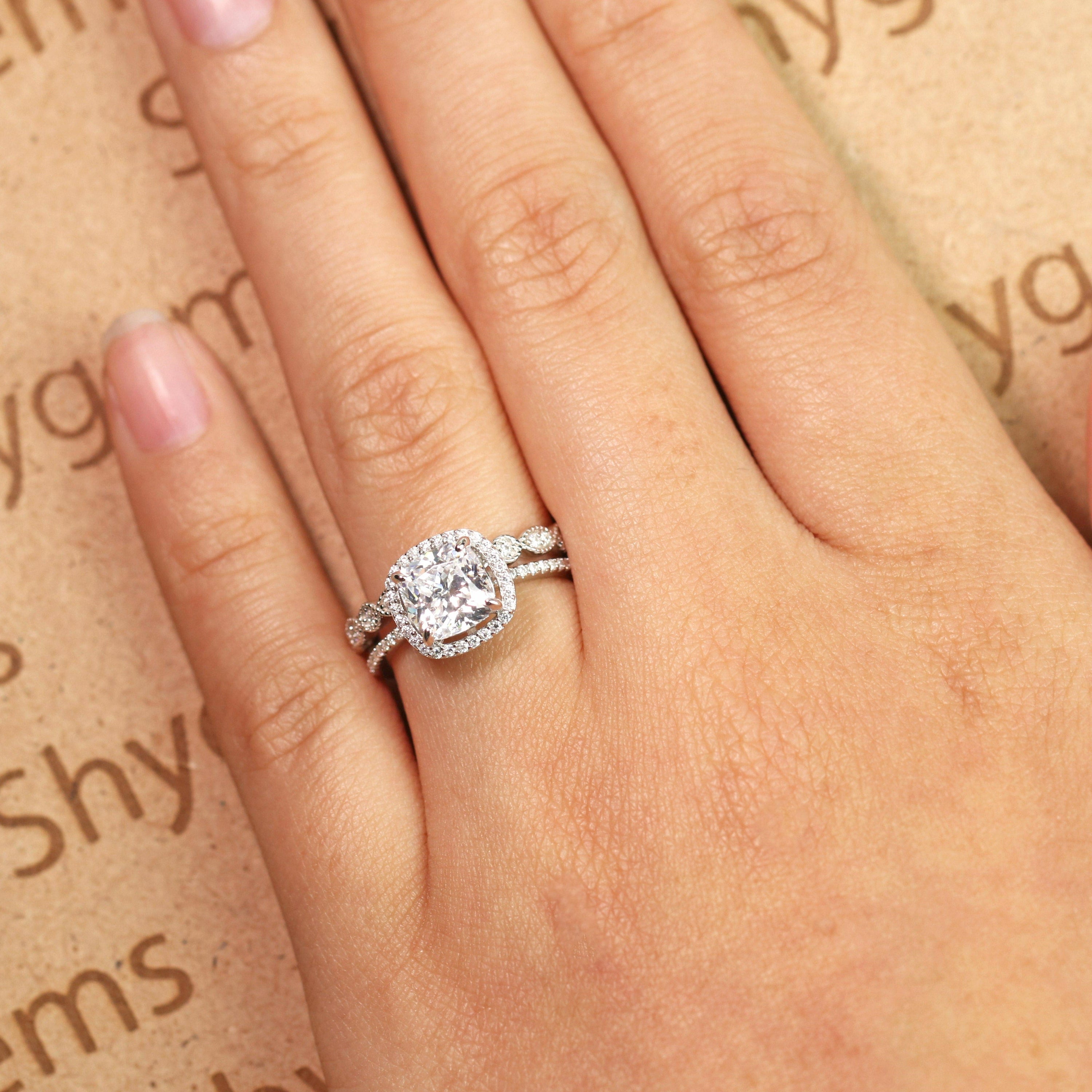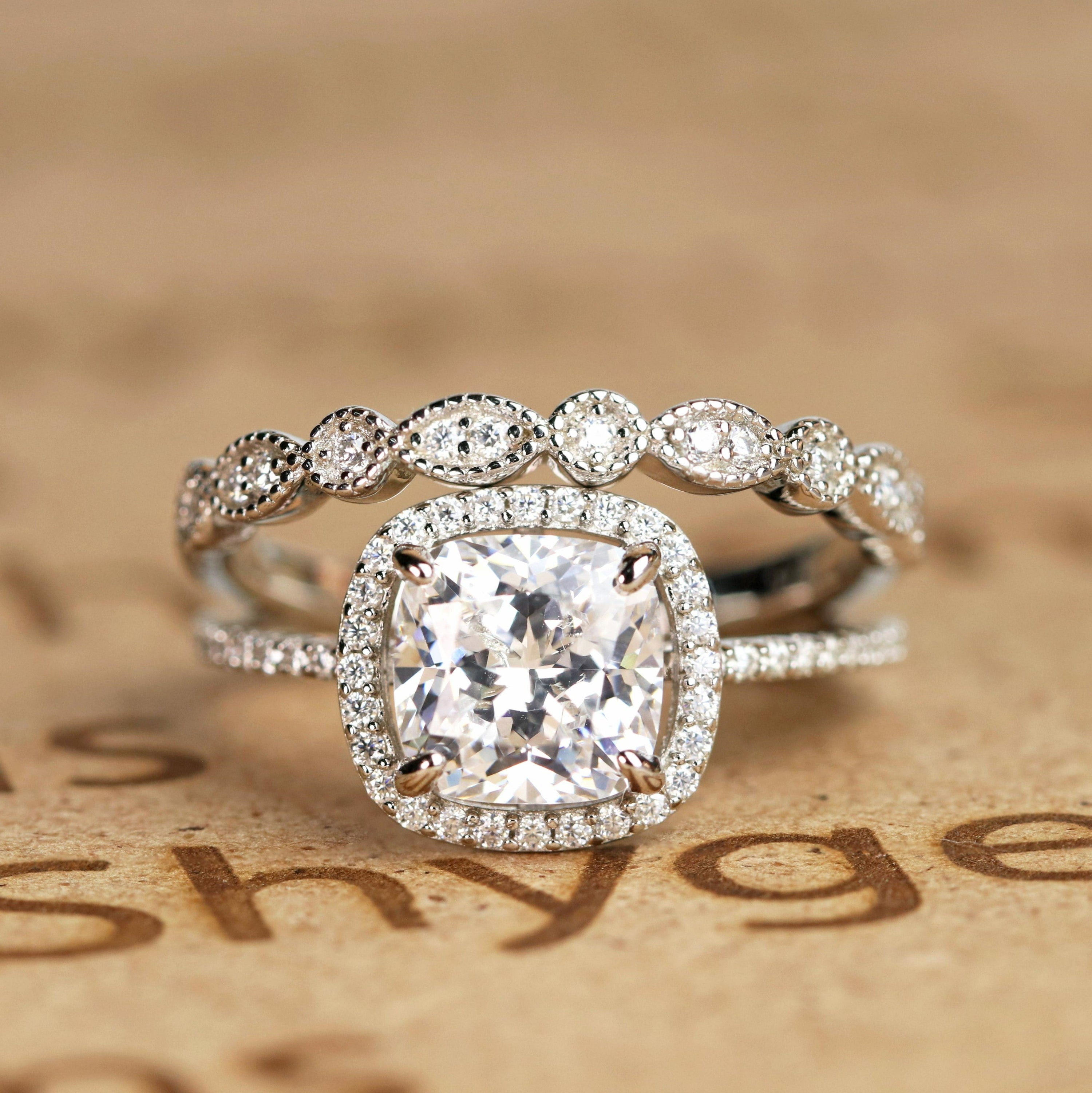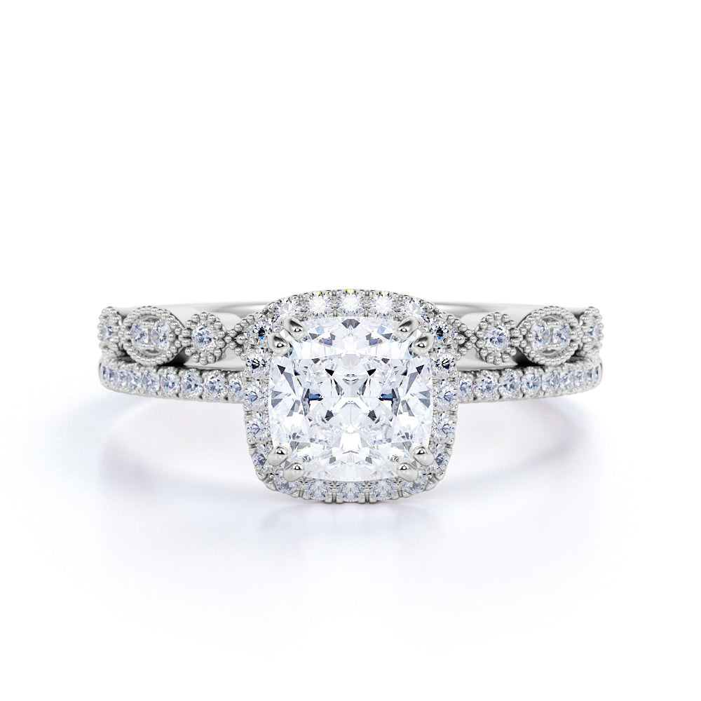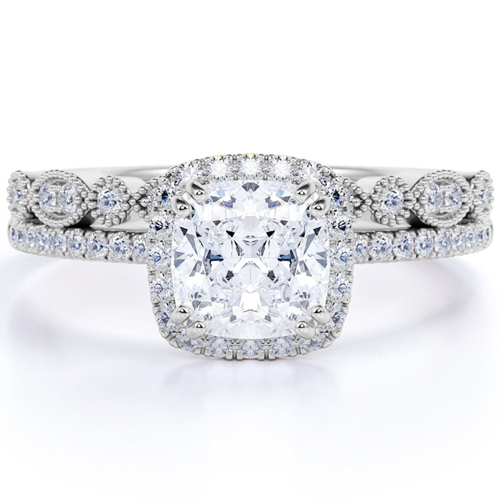 Luxurious quality at affordable price, this 1.5 carat cushion cut Moissanite and Diamond Halo Vintage Bridal Wedding Ring Set in White Gold. The matching bridal wedding ring set features cushion cut moissanite with diamonds for a total carat weight of 1.5 carats and is made in solid 10k White Gold. The order comes with 30 days full refund policy.