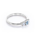 Past, Present, Future 1 Carat Round Cut Aquamarine And Diamond Three Stone Engagement Ring In White Gold. This simple three-stone ring signifies the past, future, and present. A perfect option for those who love simple ring style. The great quality of the perfect blue aquamarine center stone offers a very expensive look. Handcrafted with passion, this promise ring highlights the prong setting securely holding the stones in place while maintaining brilliance. Made with a perfect blue round-cut aquamarine center stone with diamond side stones on each side for the gold rings and moissanite for the silver ring options that weigh a total of 1 carat. The three-stone engagement ring is also a perfect choice for your everyday wear ring as it would surely match any outfit. Simply elegant in white gold, this promise ring is also available in rose gold, yellow gold, and black gold. Also, it can be made between 18k gold over silver, 10k gold, or 14k gold depending on your preferred customization. Please kindly note for the silver ring option that silver is a very sensitive metal, any chemicals like hand creams, lotion, or sanitizers. etc., can affect the plating.