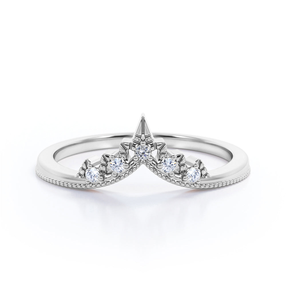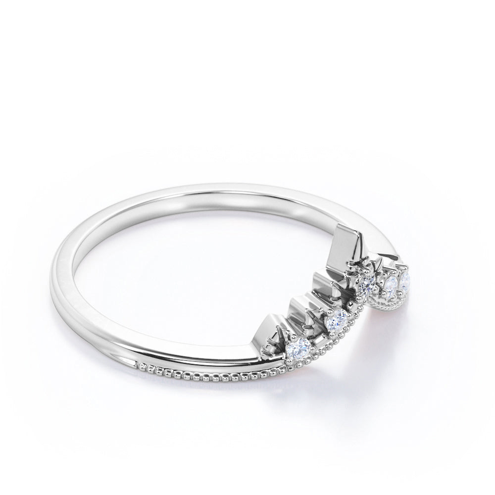 Milgrain Bordered 0.10 TCW Round Cut Moissanite Crown Design Wedding Band in White Gold