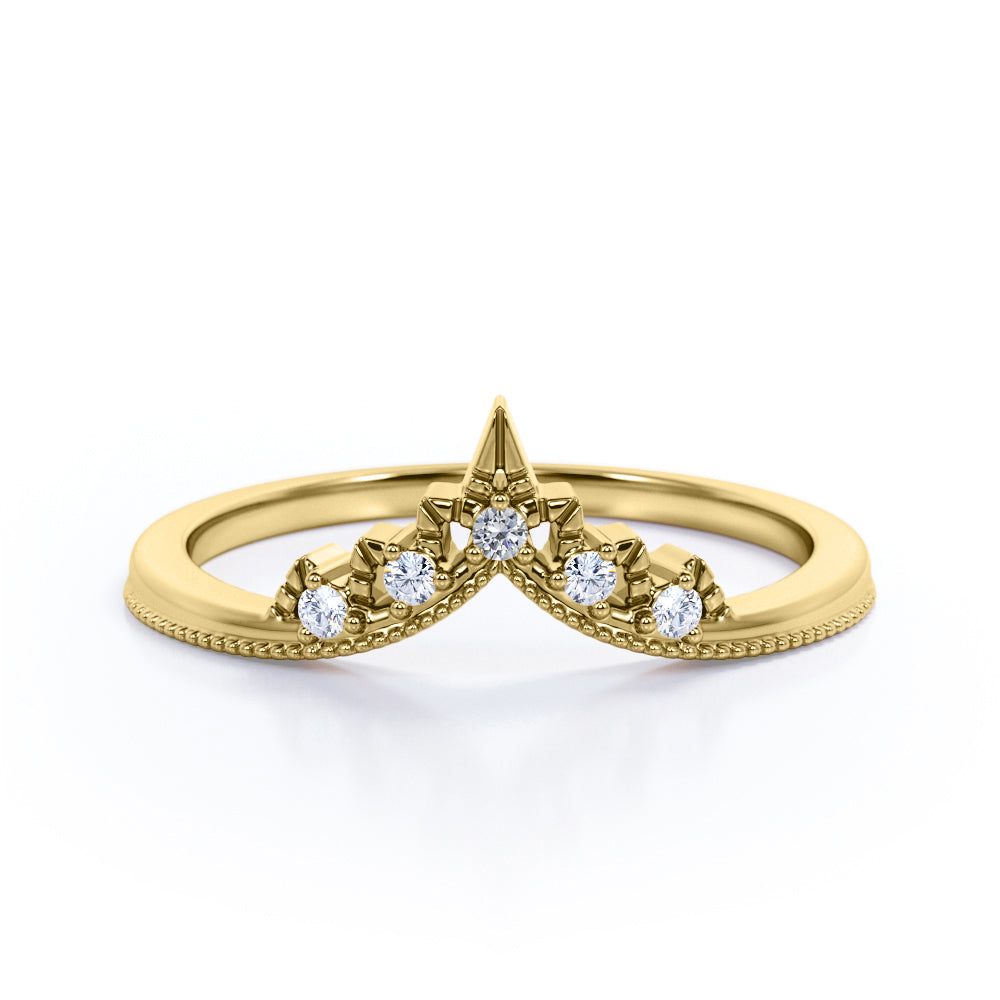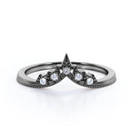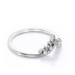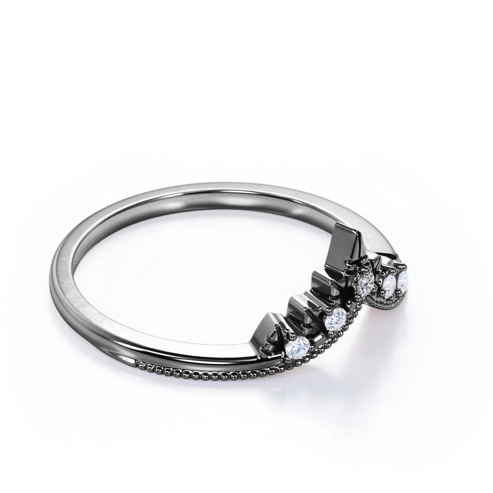 With this Milgrain Bordered 0.10 TCW Round Cut Moissanite Crown Design Wedding Band in White Gold, your significant other will be on cloud nine all the time. Hand-cut with deftness into a lovely shape round cut by our lapidary expertise, this elegant inexpensive moissanite wedding band integrates total 0.10 carat moissanite on solid black gold. Distinct and unusual, this cheap moissanite wedding band is an excellent choice. with its dazzling beauty, this moissanite band will bring joy and good energy to its wearer. This women's moissanite wedding band is stunning and inexpensive, thanks to its reasonable price. If you are looking for a moissanite ring for any special event, such as a birthday, an engagement, or a marriage proposal, this moissanite band for women , the birthstone ring for the fourth month, represents riches and extravagance and would make an excellent gift for friends or your better half. Also, this gold moissanite wedding band can be customized, so customers can choose one of metal colors between white gold, rose gold, yellow gold, and black gold. Let's show her how much you care by giving her this anniversary Moissanite wedding band.