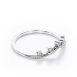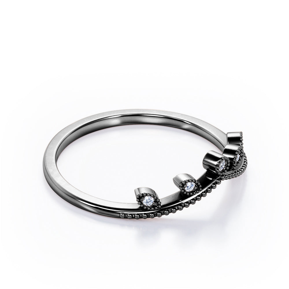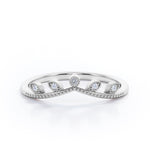 With this Milgrain Edged Band and Bezel - 0.10 TCW Round Cut Moissanite - V Curved Wedding Band, your significant other will be on cloud nine all the time. Handcrafted with care into a wonderful round cut by our lapidary expertise, this flawless women's Moissanite band is composed of total 0.10 carat Moissanite. Distinct and unusual, this anniversary Moissanite wedding band is ideal for those who wish to express their charisma and uniqueness. With its dazzling beauty, this women's Moissanite band will accentuate any outfit the wearer chooses to put on. Beautiful and affordable, this Moissanite band is a great choice for any woman's jewelry collection. This women's Moissanite band, the birthstone ring for the fourth month, represents riches and extravagance and would make an excellent gift for friends or your better half. This affordable Moissanite wedding band can be customized, so customers can choose one of metal colors between white gold, rose gold, yellow gold, and black gold.