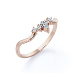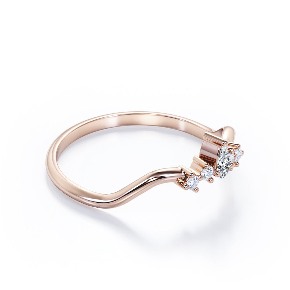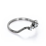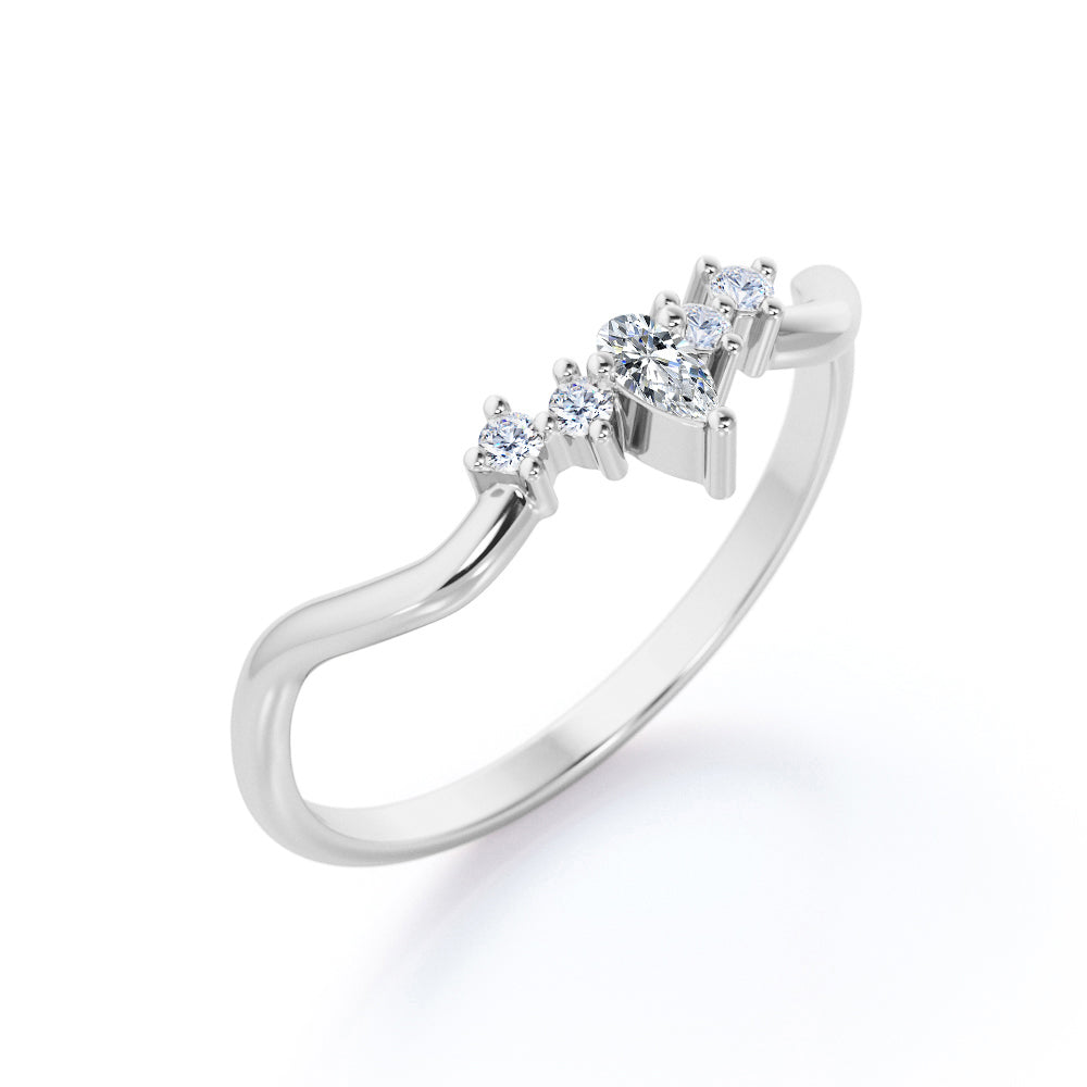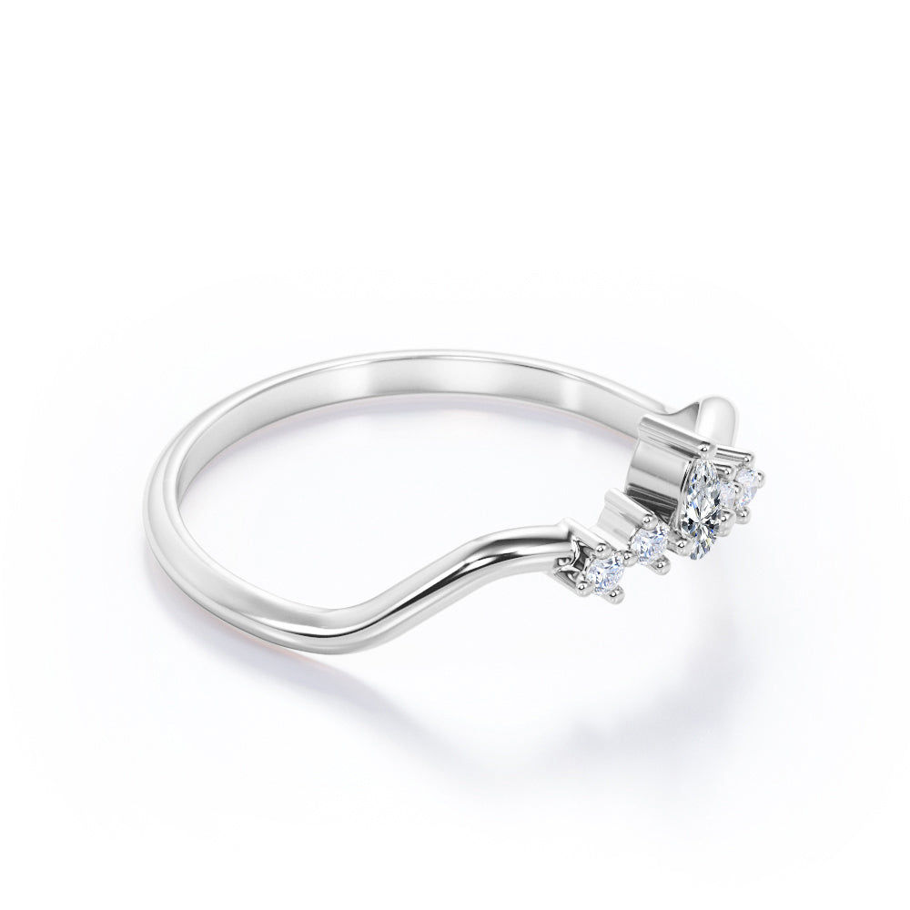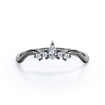 With this Prong Cluster 0.10 TCW Pear and Round Cut Moissanite Curved Wedding Band in White Gold, you can begin the most romantic chapter of your life. Hand-cut with deftness into a lovely shape pear and round cut by our most talented jewelers, this astounding Moissanite band is made up of total 0.10 carat Moissanite on solid black gold. Distinct and unusual, this Moissanite wedding ring band is ideal for those who wish to express their charisma and uniqueness. Refracting qualities of this Moissanite wedding band for women will bring joy and good energy to its wearer. This cheap Moissanite wedding band is a great choice for any woman's jewelry collection. This cheap Moissanite wedding band a great choice. This Moissanite wedding band can be customized, so customers can choose one of metal colors between rose gold, white gold, black gold, and yellow gold. Let's show her how much you care by giving her this gold Moissanite band.