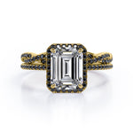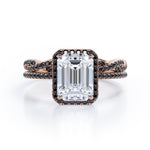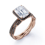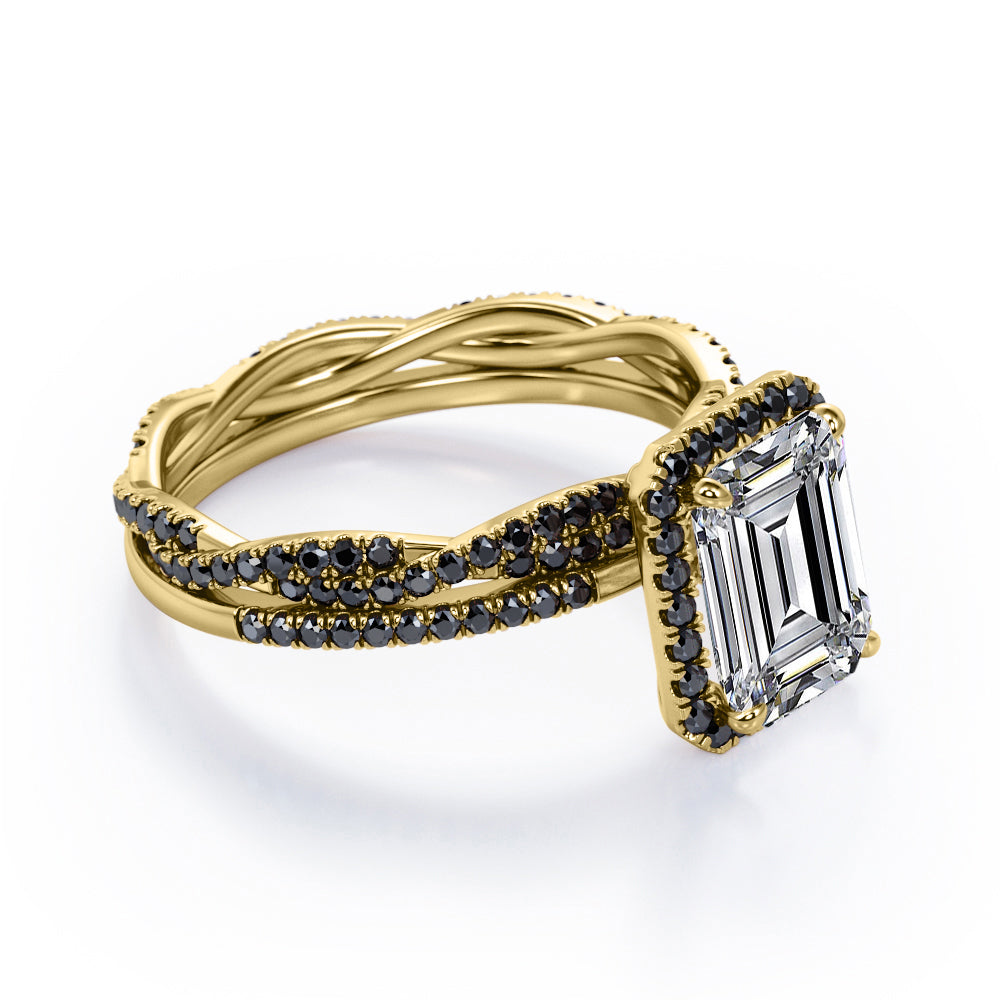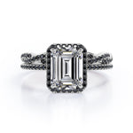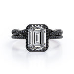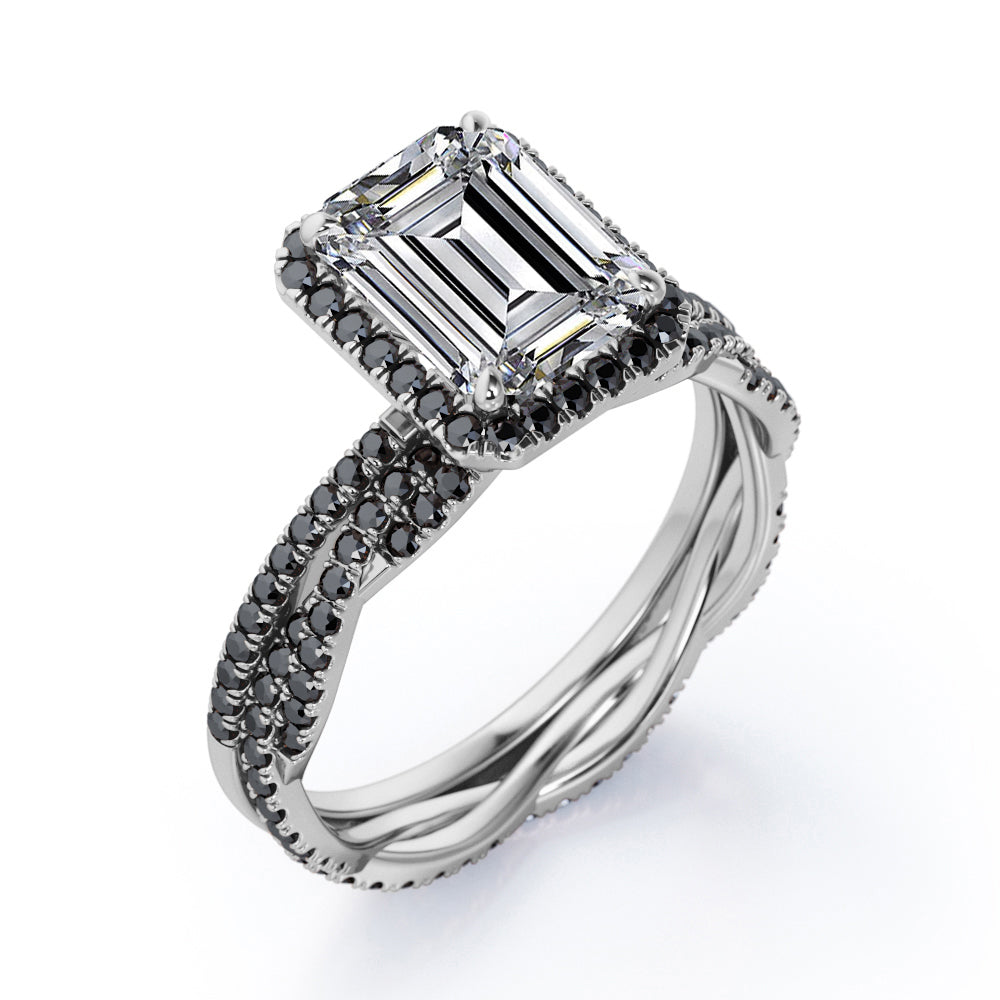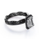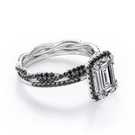 Make someone you love feel amazed by the brilliance of this Crossover with Pave Accents - 1.75 TCW Emerald Cut Moissanite with Lab Created Black Diamond - Halo Bridal Ring Set in White gold. Skillfully hand-cut into a nice emerald cut by our skilled jewelers, this flawless moissanite jewelry integrates total 1.75 carat moissanite and lab-created black diamonds. Distinctive and extraordinary, this moissanite band rings set is well-suited for those who are not quite into normal lifestyle. With naked eyes moissanites look, shine and feel exactly like diamonds. Reflective properties of this moissanite stone engagement rings set will enhance happiness and attract positive vibes. This moissanite stone engagement rings set is beautiful and accessible since it is available at a reasonable price. Moissanites are the most popular alternative gemstone for diamonds while being at lower and more affordable price. Considered as a symbol of timeless love and affection for your lover, this sterling silver moissanite wedding rings set can definitely help you out. Also, this moissanite silver engagement rings set can be customized to your own choice of metal colors: White gold, rose gold, yellow gold and black gold in 18k Gold over Silver, 10k and 14k gold metal options. In regards to its hardness, moissanite is almost as hard as diamond which means that it is notably durable. Let's fulfill your love story with this moissanite sterling silver rings set, and she will be eternally joyful.