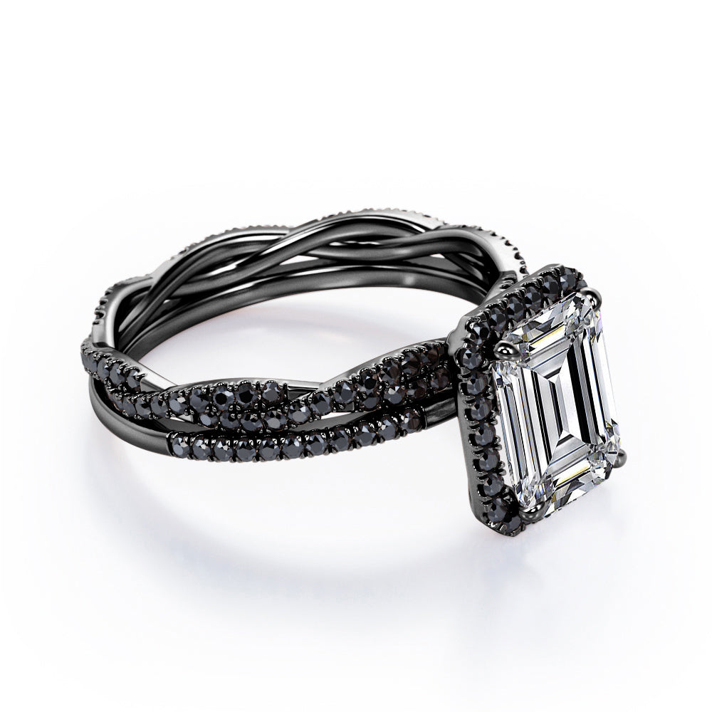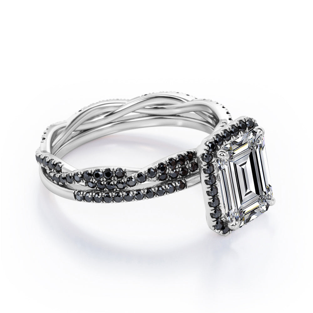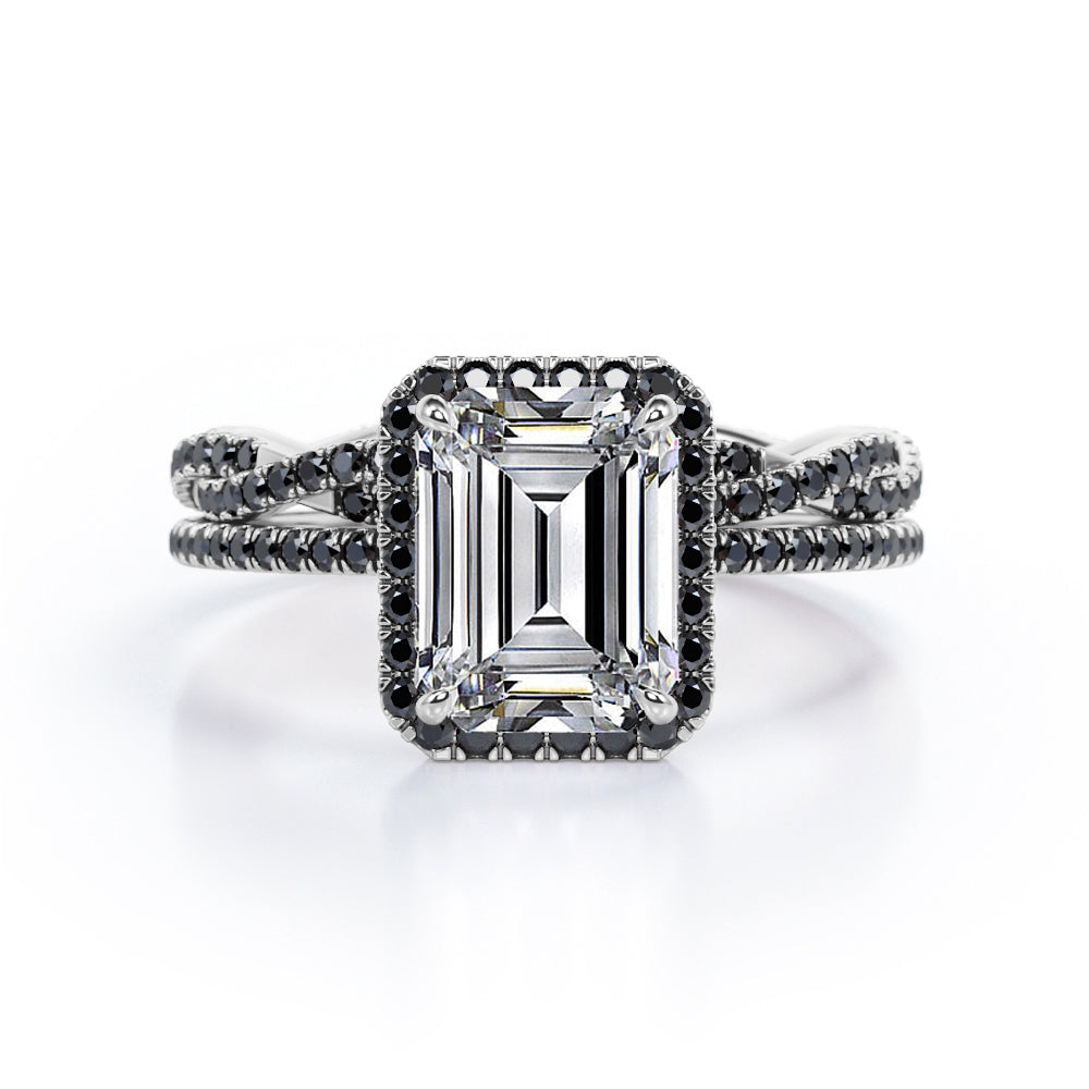Crossover with Pave Accents - 1.75 TCW Emerald Cut Moissanite with Lab Created Black Diamond - Halo Bridal Ring Set in White Gold